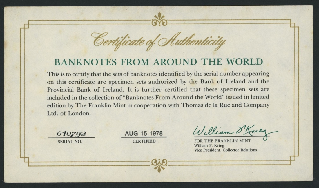 with Certificate of Authenticity for "Banknotes from Around the World" specimen sets authorised by the Bank of Ireland, produced by Thomas de la Rue for The Franklin Mint, certificate dated 15th August 1978, serial number 010792, with William F. Krieg signature