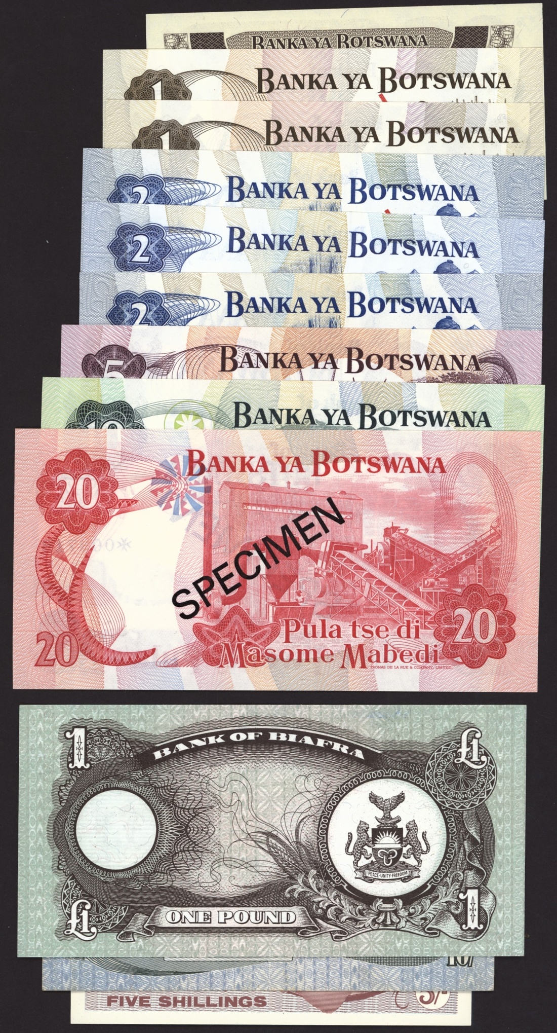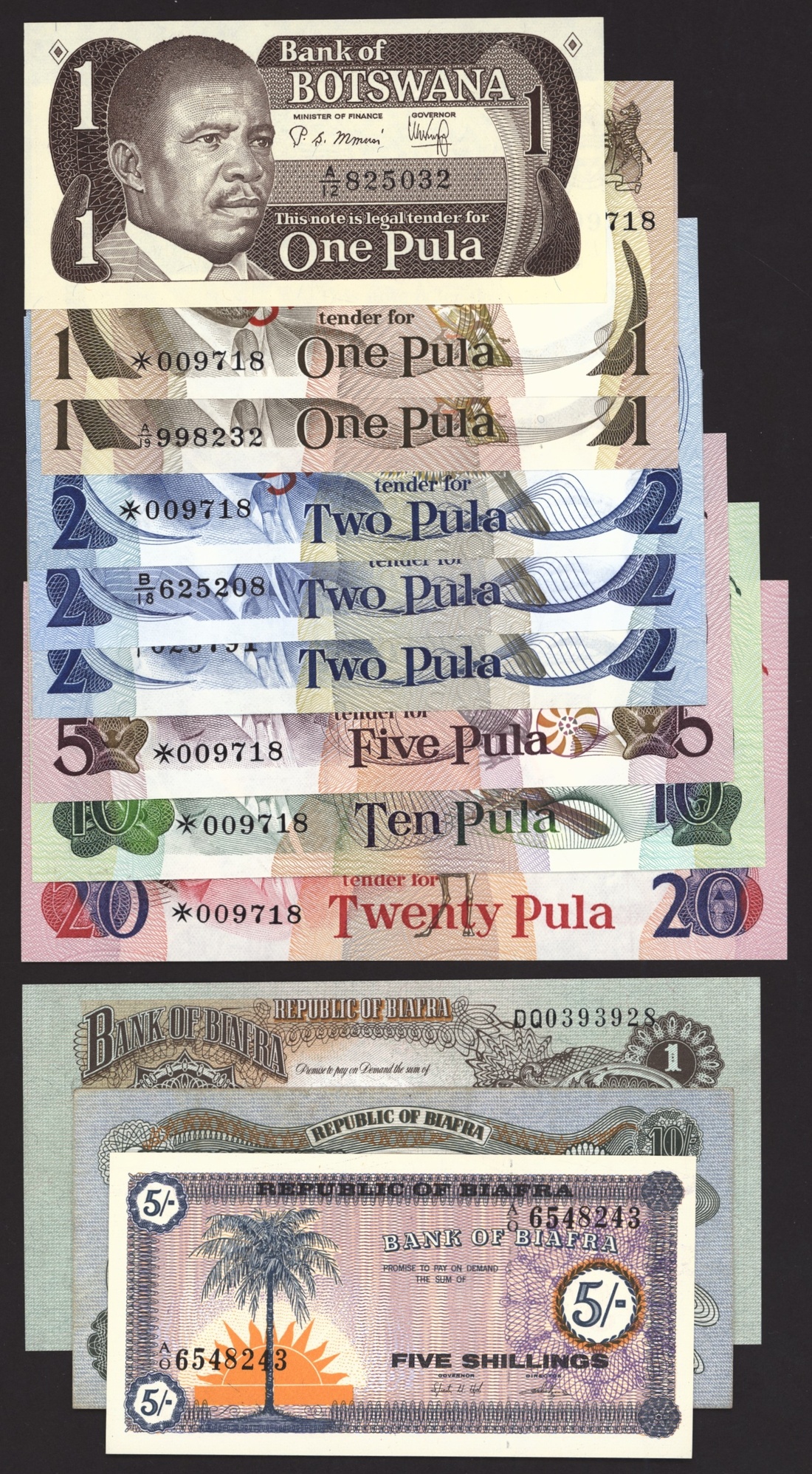 Bank of Botswana (9): 1, 2, 5, 10, 20 Pula, 1976-1982;