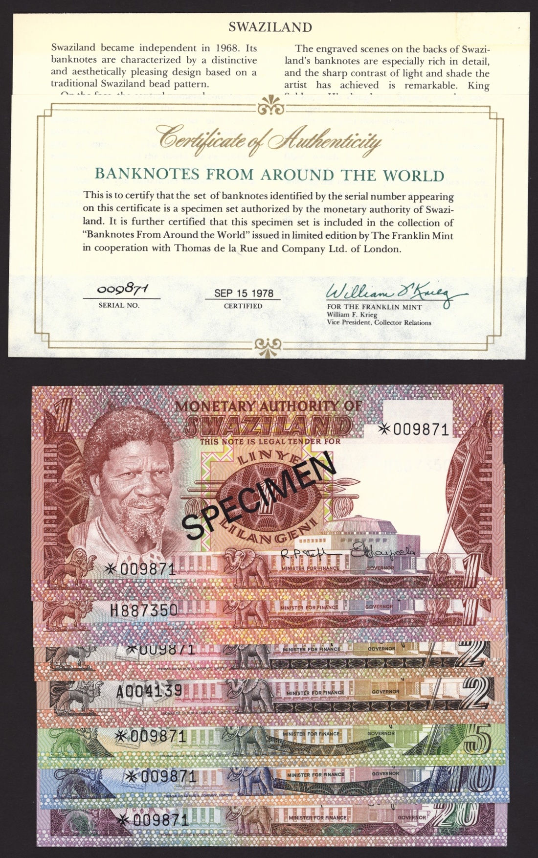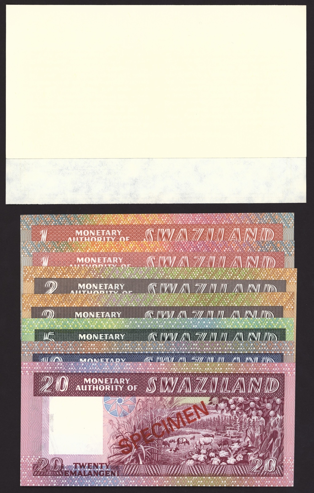 Bank of Swaziland (7): 1, 2, 5, 10, 20 Emalangeni, 1974-8;