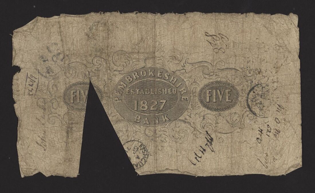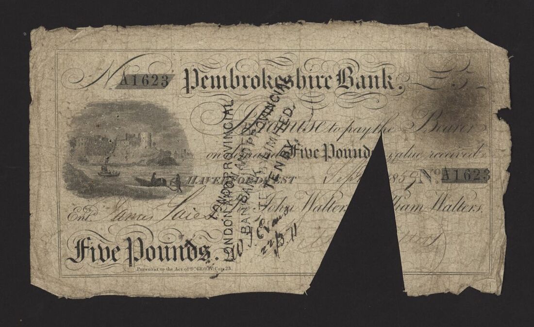 Pembrokeshire Bank, Milford & Pembrokeshire Bank, [2 notes] 1 Guinea, £5, 1809-1859, Pembrokeshire Bank: £5, September 1859, no. A1623, for Walters & Walters;