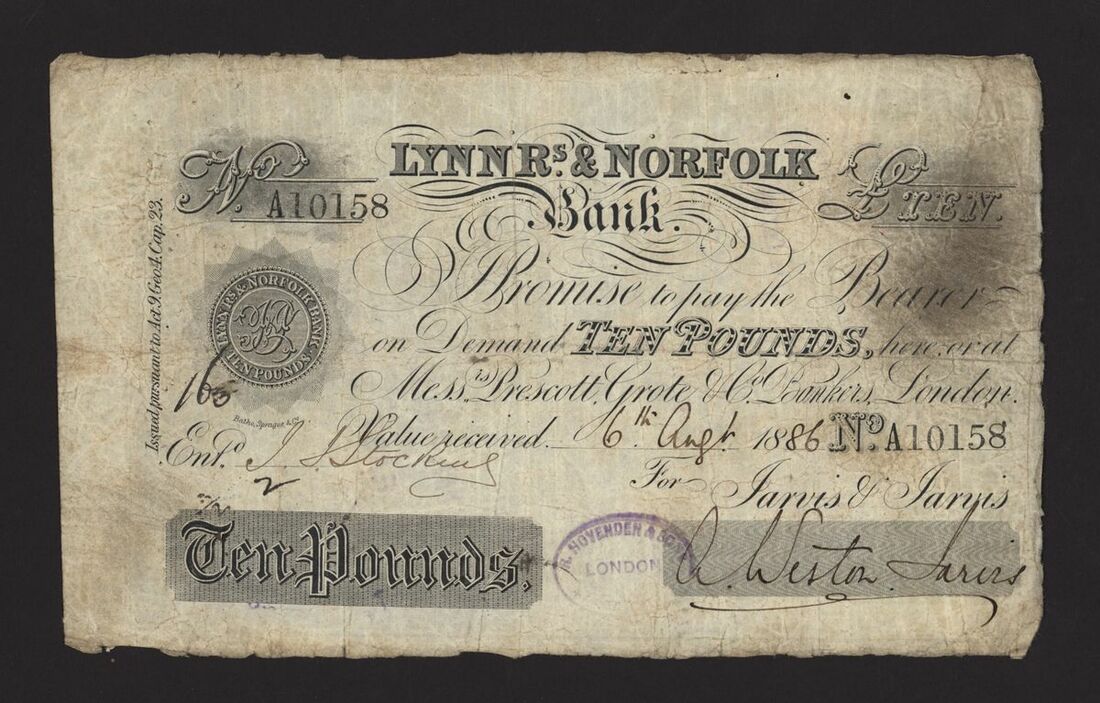 Lynn Regis & Norfolk Bank, £10, 6 August 1886, no. A10158, for Jarvis & Jarvis, signed A. Weston Jarvis