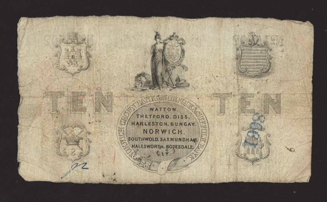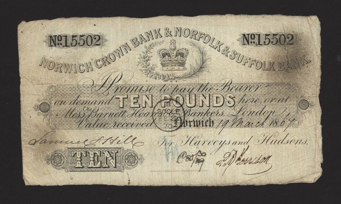 Norwich Crown Bank & Norfolk & Suffolk Bank, £10, 19 March 1867, no. 15502, for Harvey and Hudsons, signed Kerrison