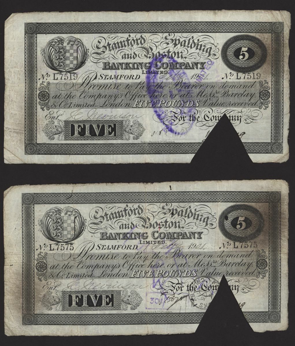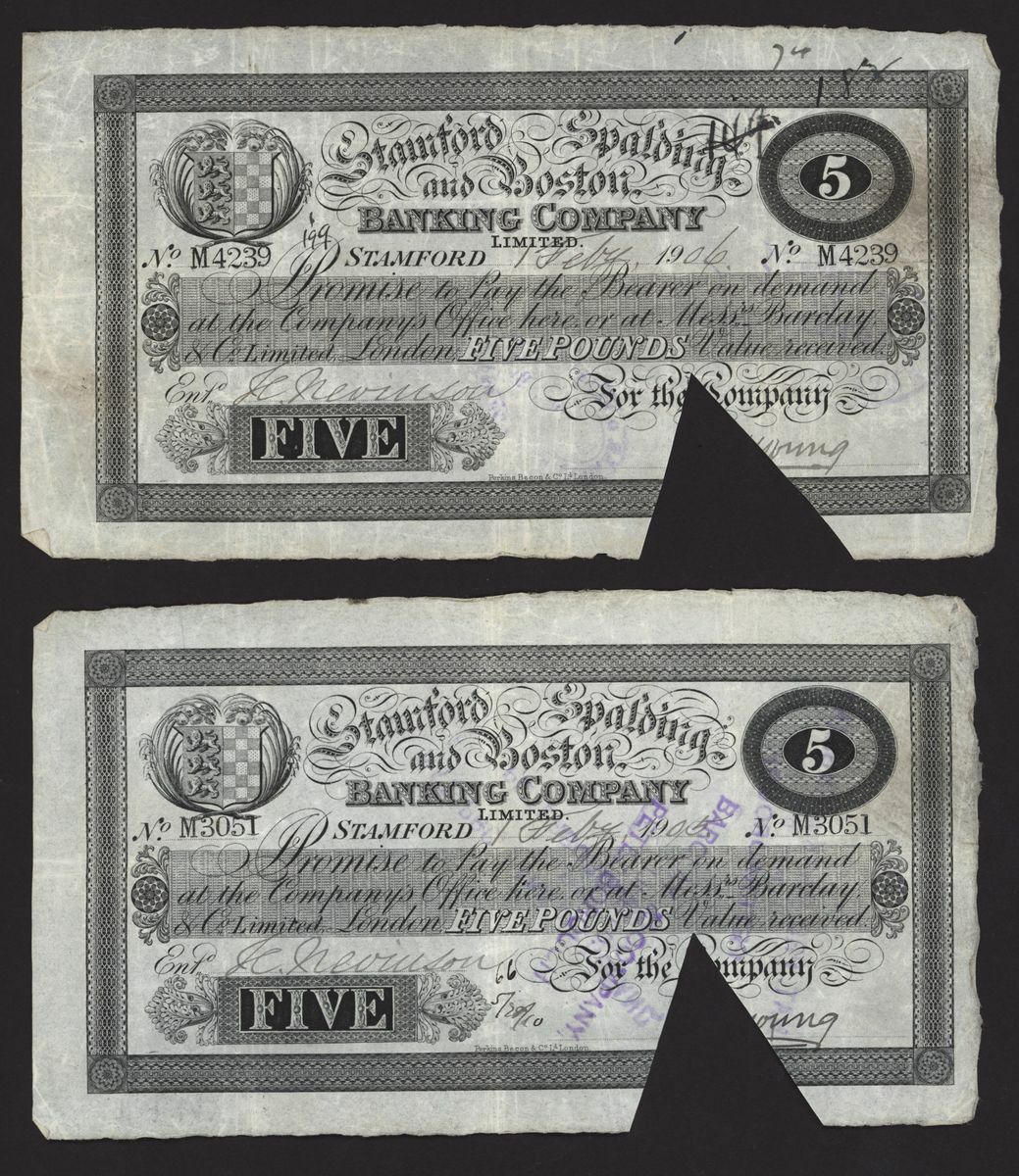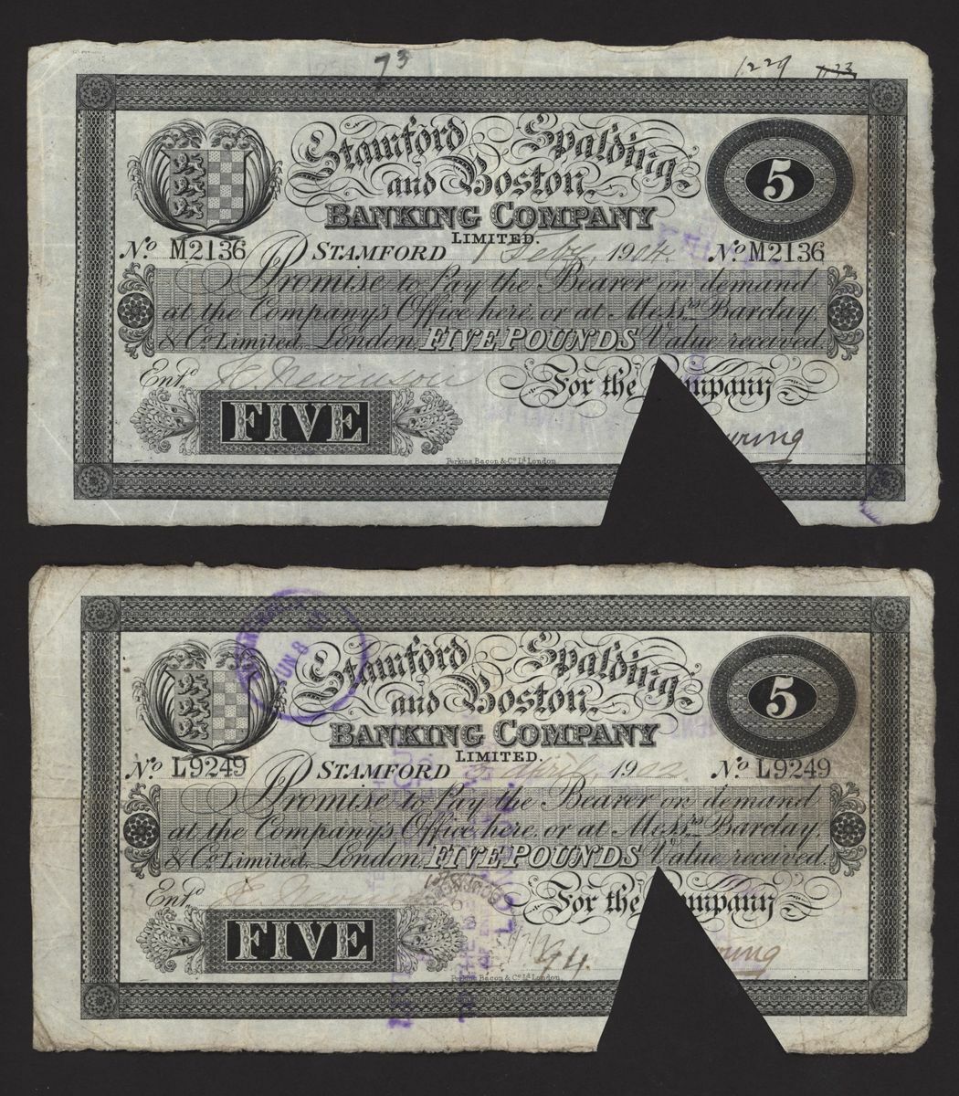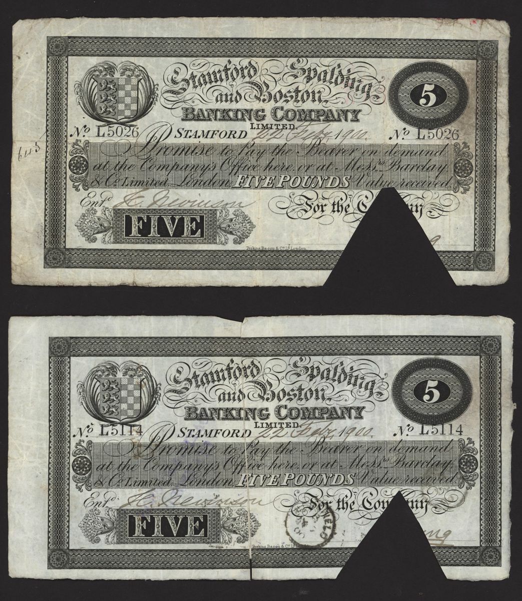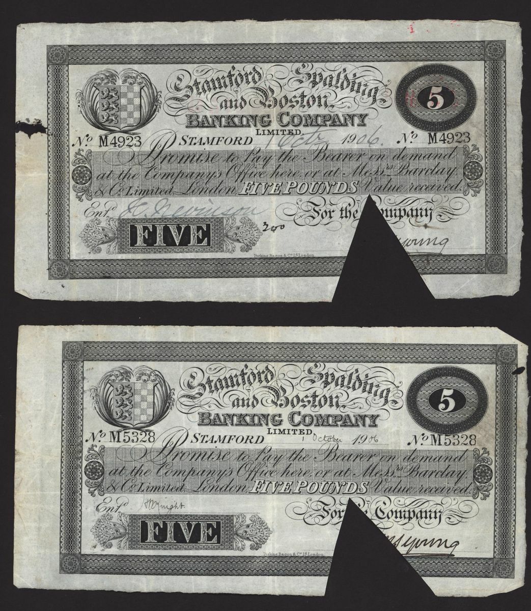 Stamford, Spalding, & Boston Banking Company, [10 notes] £5, 1900-1906, all for the Company, signed Young,