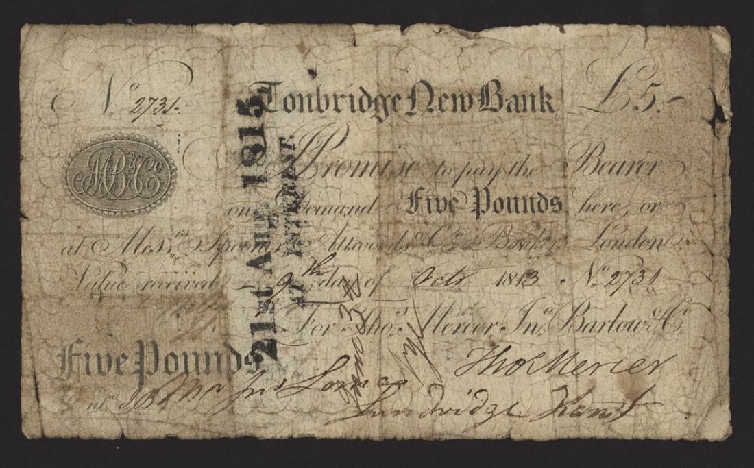 Tonbridge New Bank, £5, 9 October 1813, no. 2731, for Mercer, Barlow & Co., signed Thos. Mercer