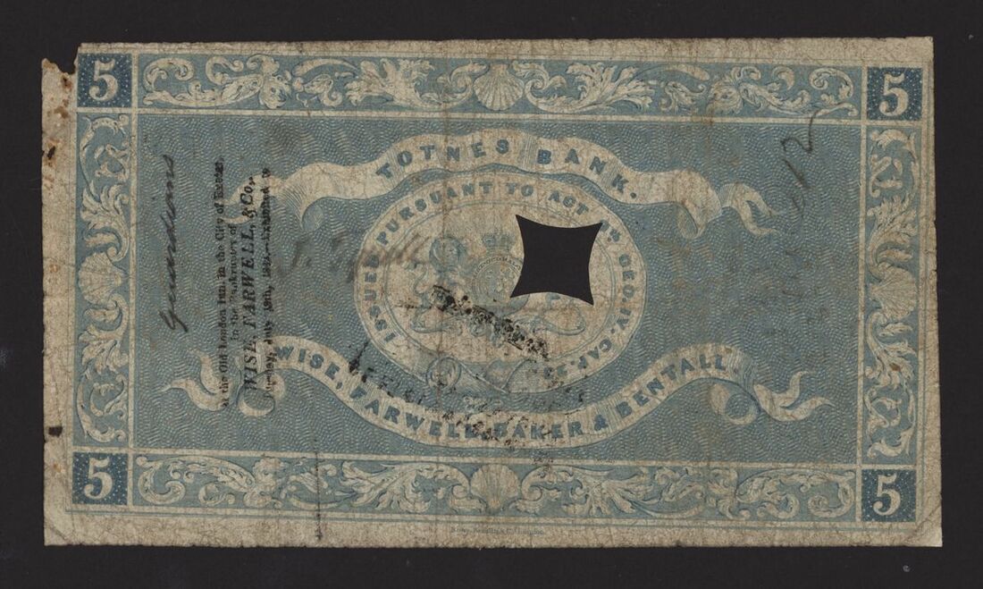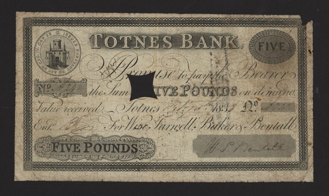 Totnes Bank, £5, Devon, 5 February 1838, no. A242, for Wise, Farnell, Baker & Bentall, signed W.S. Bentall