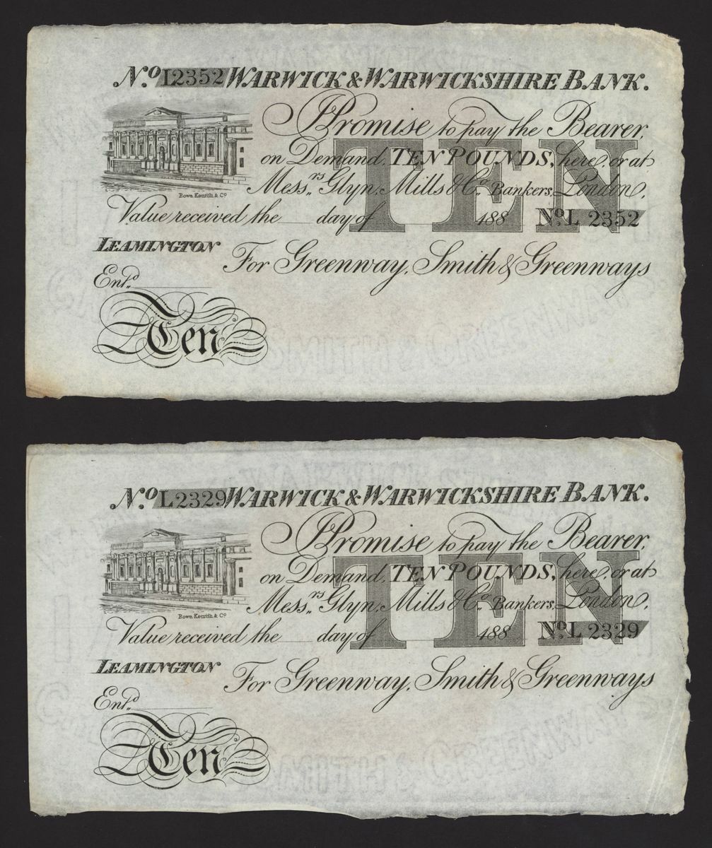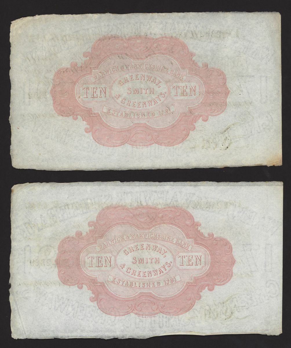 Warwick & Warwickshire Bank, [2 notes] £10, unissued, Leamington, 188-, no. L2329 and no. L2352 for Greenway, Smith & Greenways