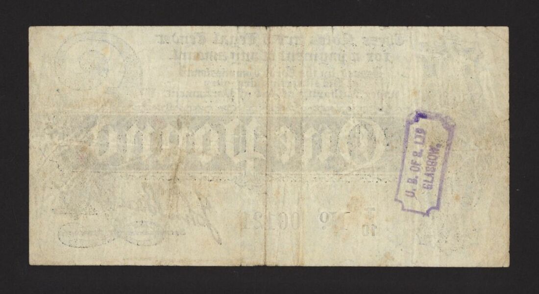 Treasury, £1, ND (1914), no. T/10 00121, J. Bradbury, Union Bank of Scotland Glasgow stamp on reverse