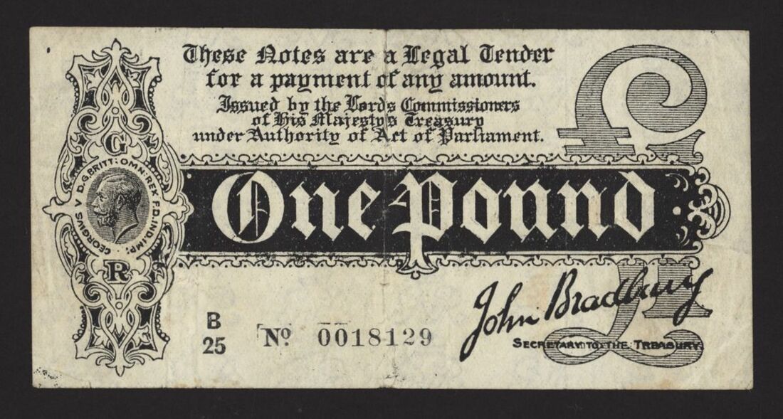Treasury, £1, ND (1914), no. B/25 0018129, J. Bradbury, (Pick 347, EPM T5.4b), tear at centre, good fine