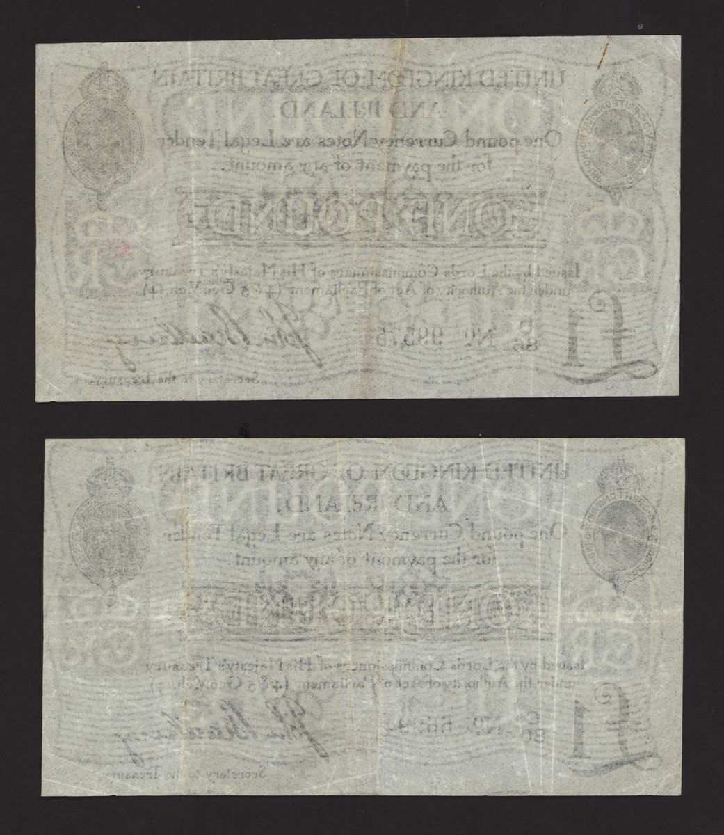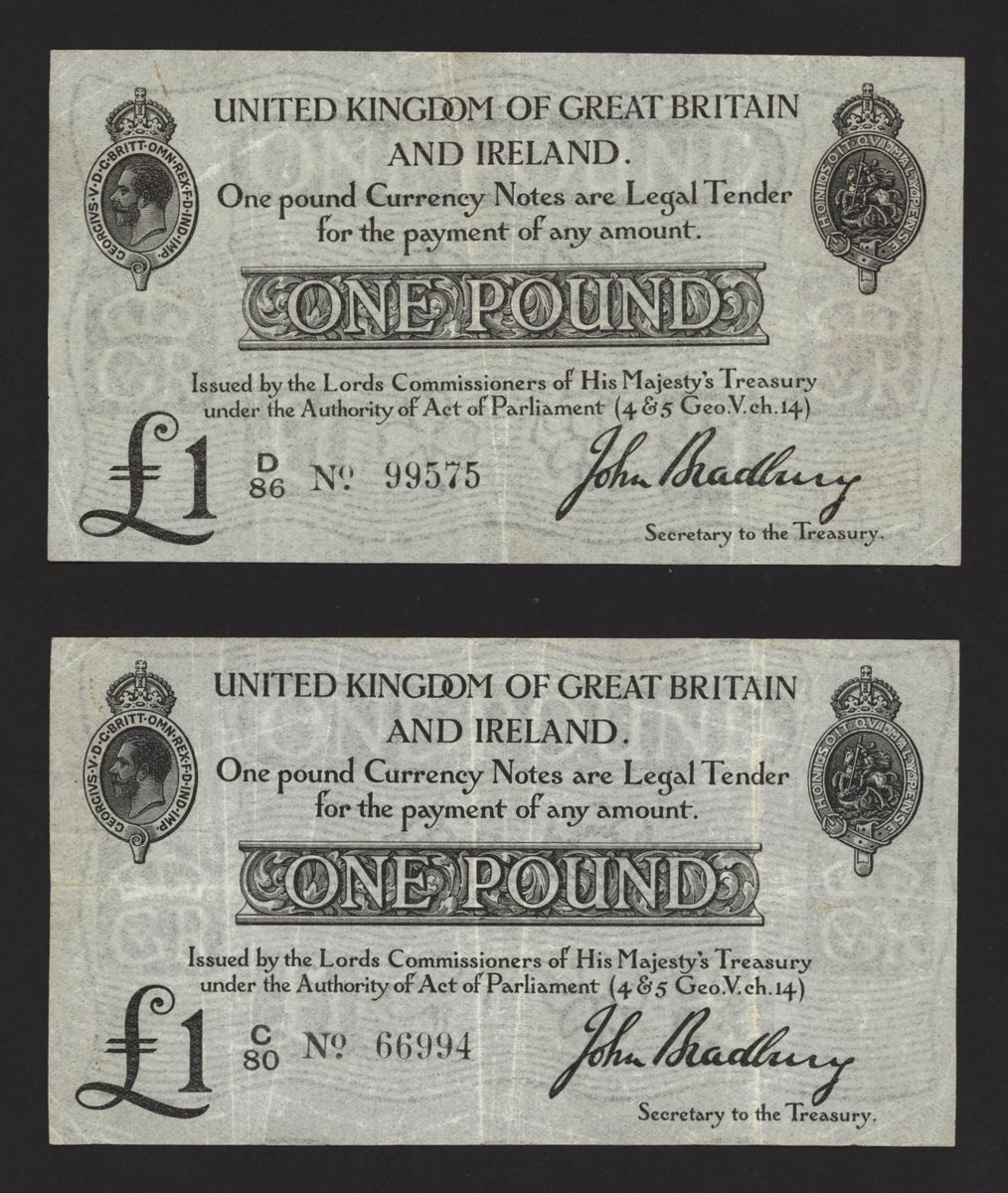 Treasury, [2 notes] £1, ND (1914), J. Bradbury, no. C/80 66994, no. D/86 99575
