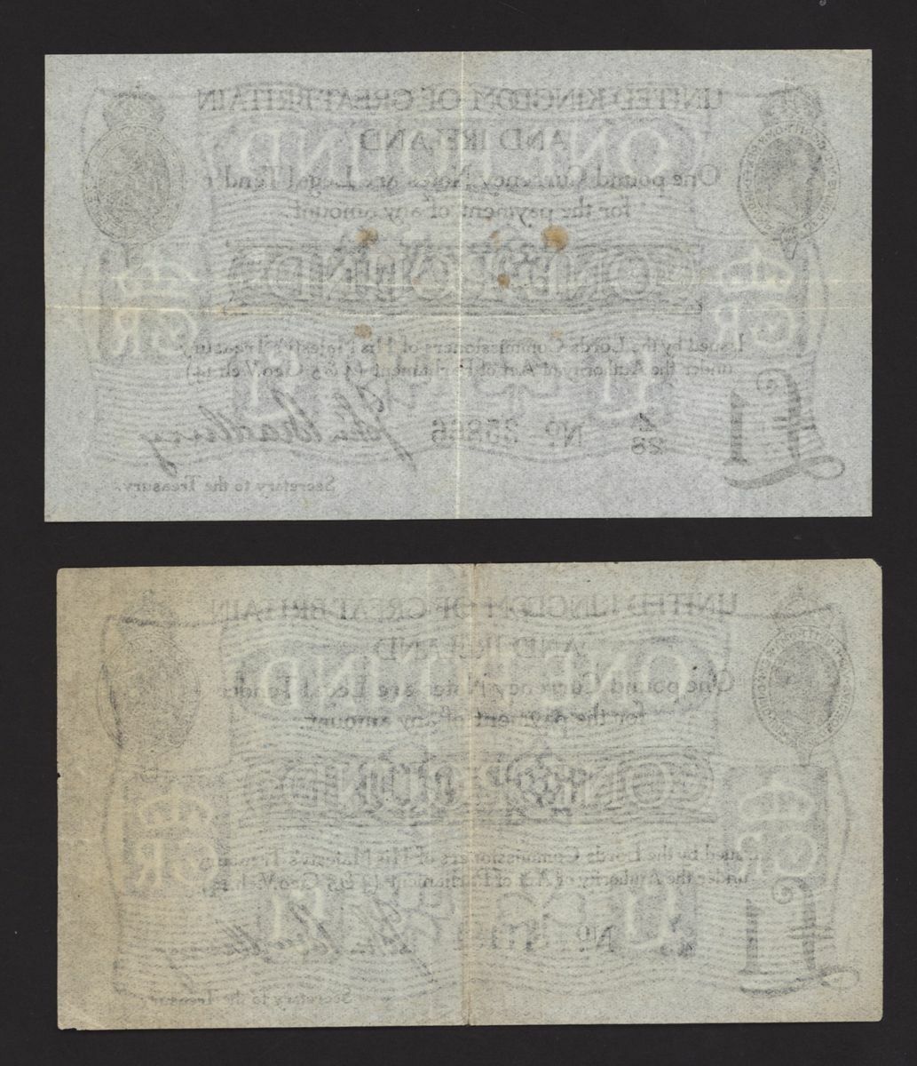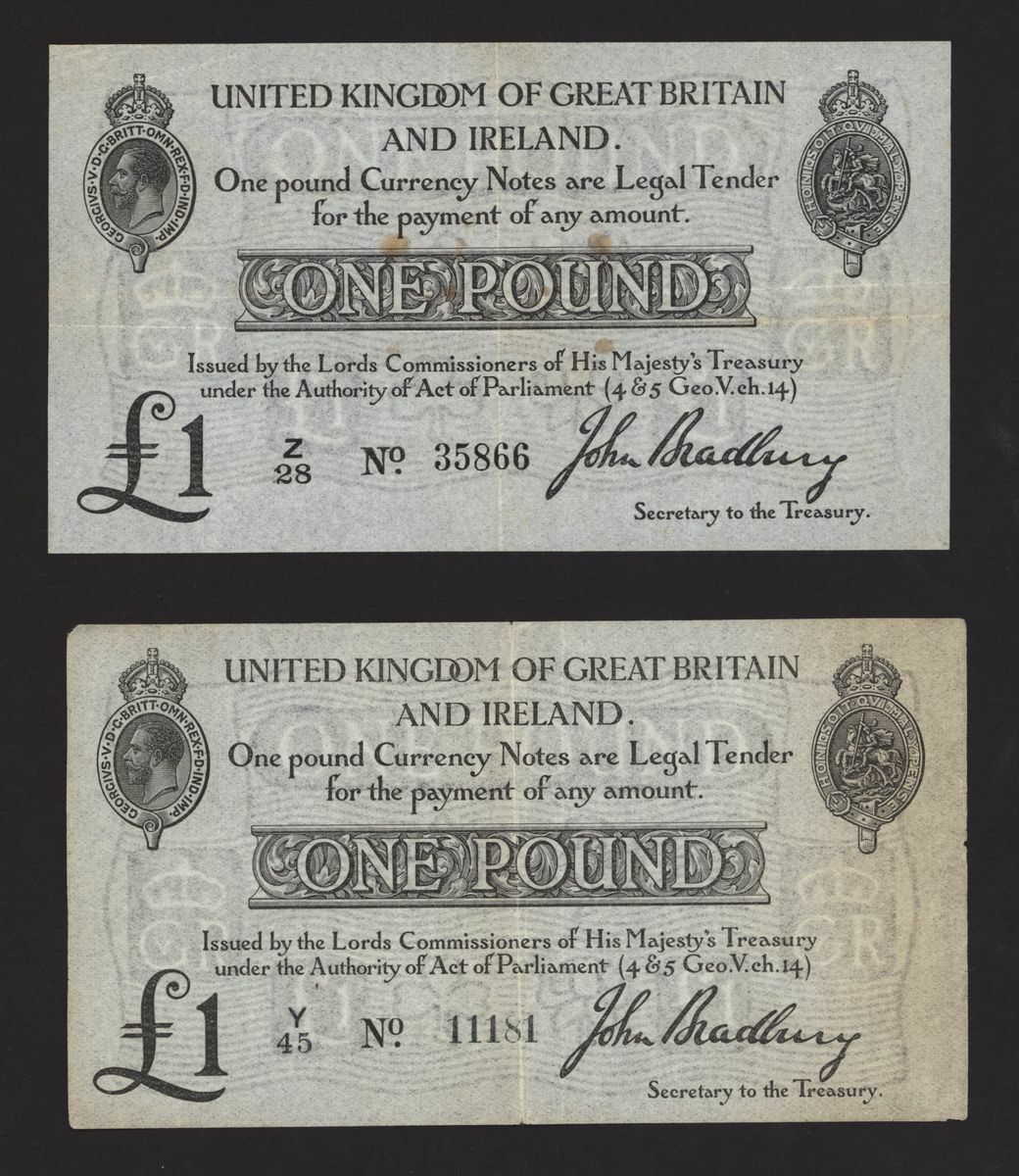 Treasury, [2 notes] £1, ND (1914), J. Bradbury, no. Y/45 11181, no. Z/28 35866