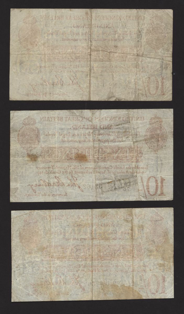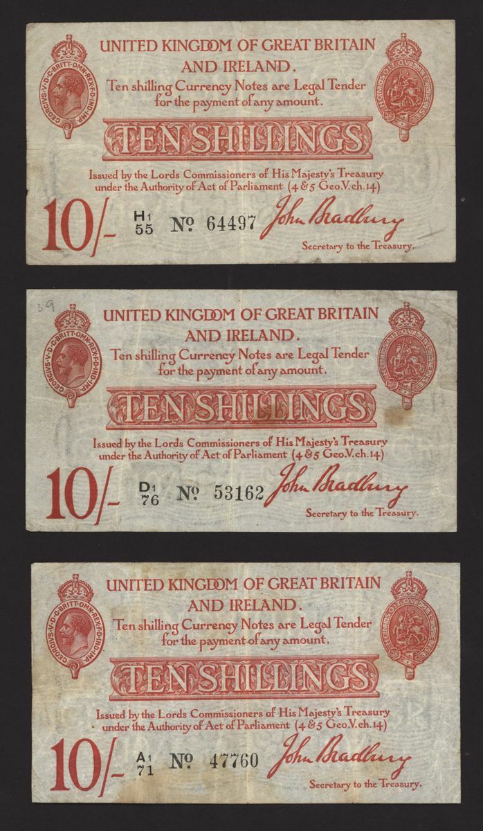 Treasury, [3 notes] 10 Shillings, ND (1915), J. Bradbury, no. A1/71 47760, no. D1/76 53162, and no. H1/55 64497