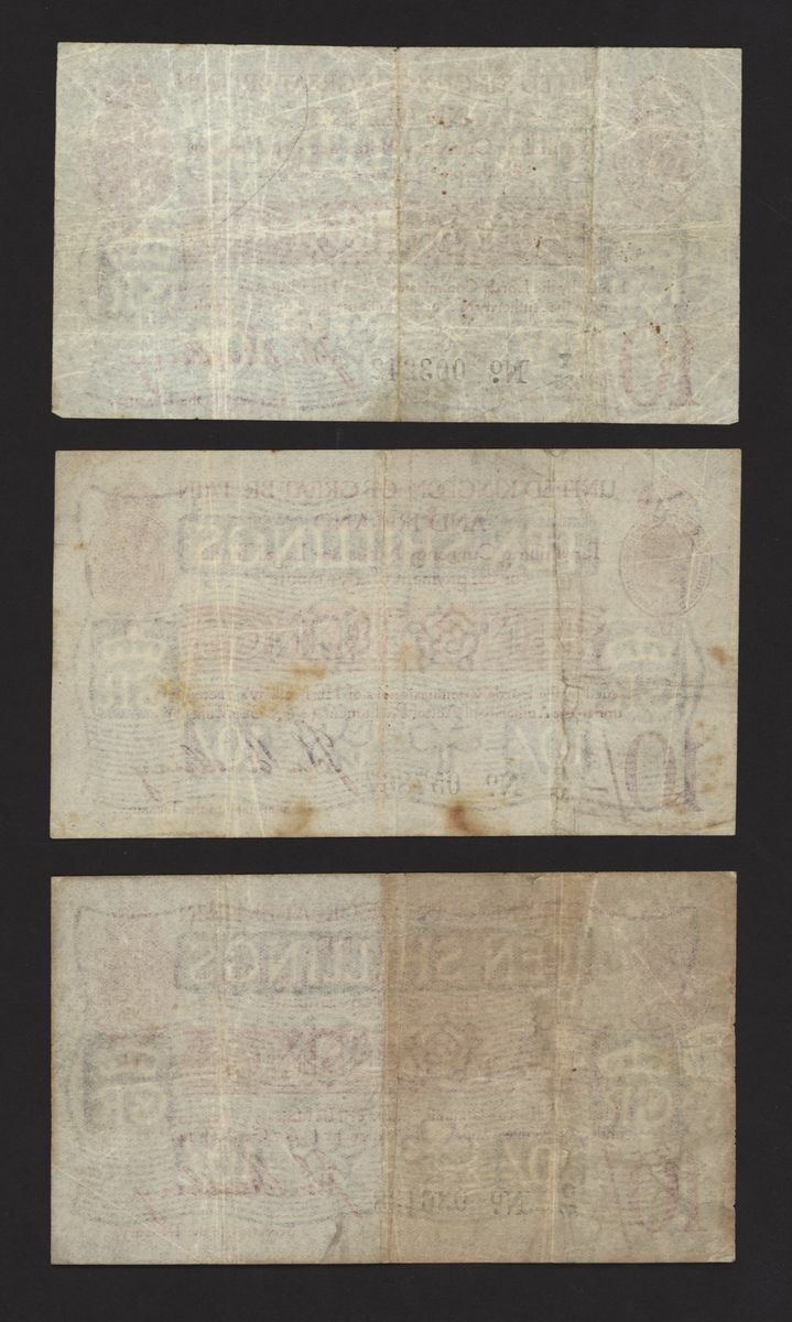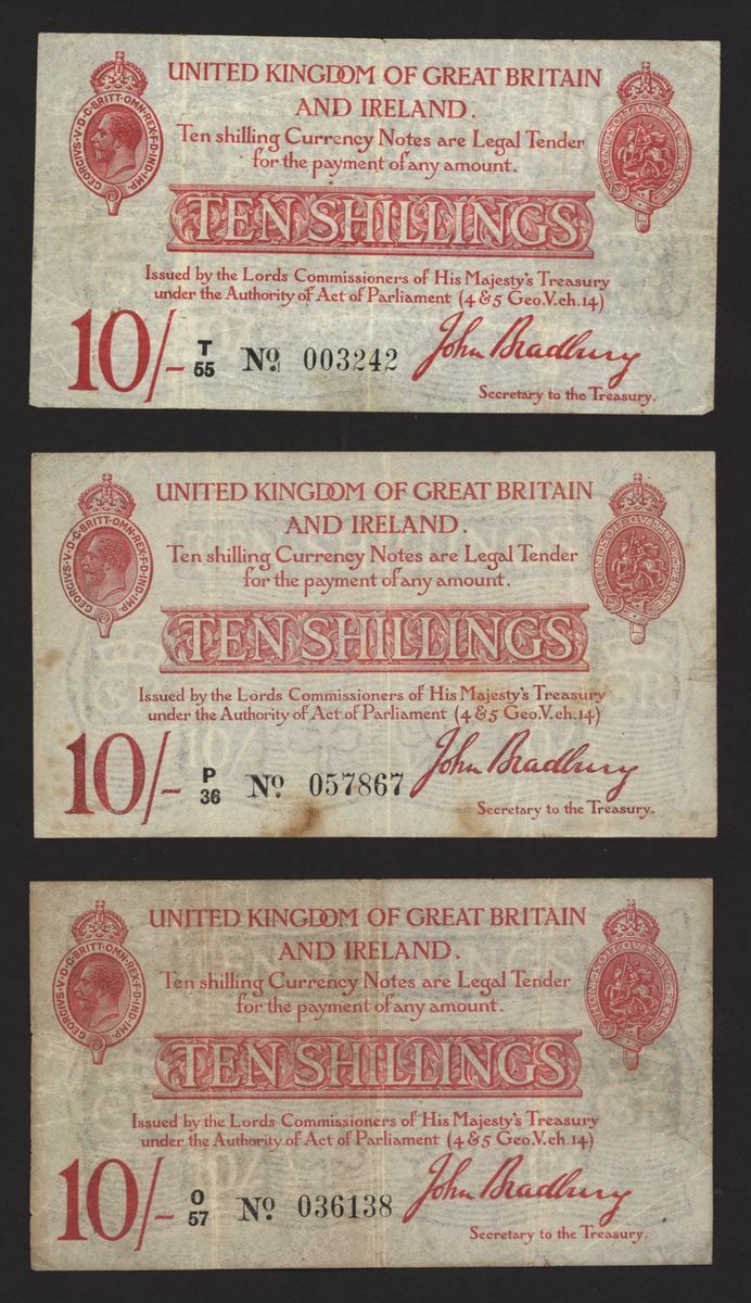Treasury, [3 notes] 10 Shillings, ND (1915), J. Bradbury, no. O/57 036138, no. P/36 057867, and no. T/55 003242