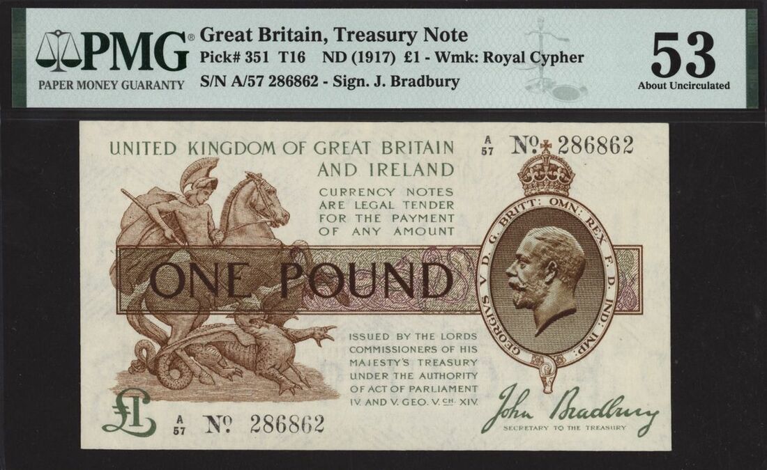 Treasury, £1, ND (1917), no. A/57 286862, J. Bradbury. (Pick 351, EPM T16), in PMG holder 53 About Uncirculated