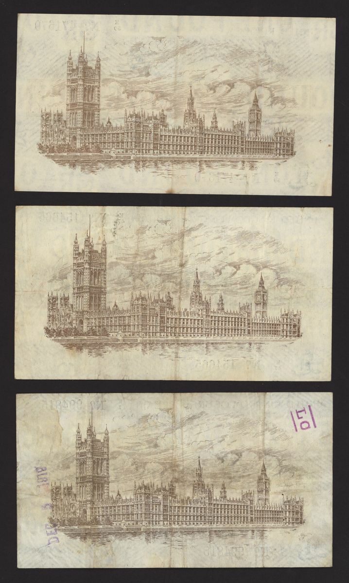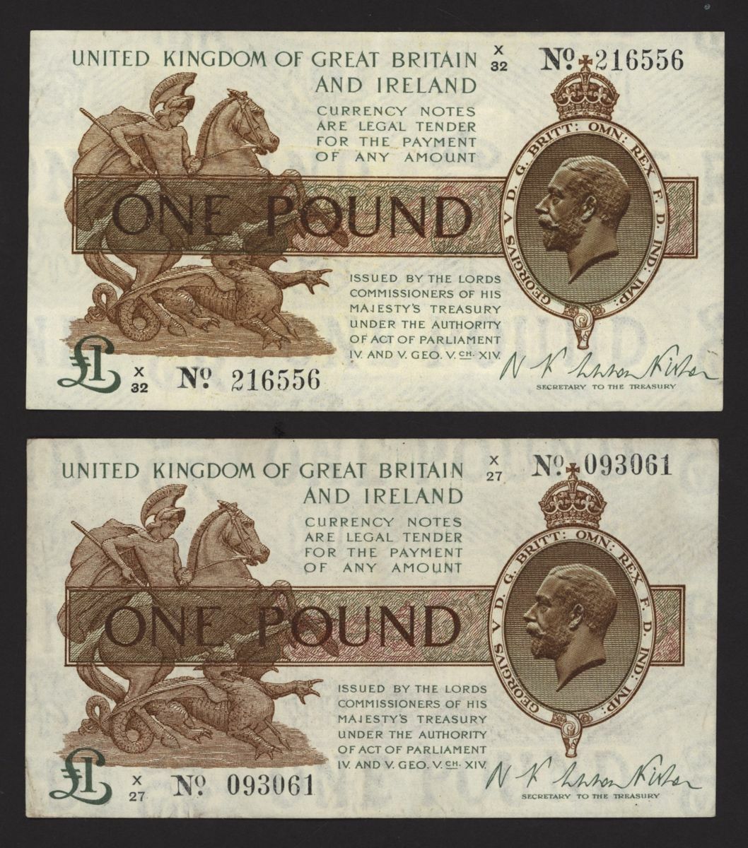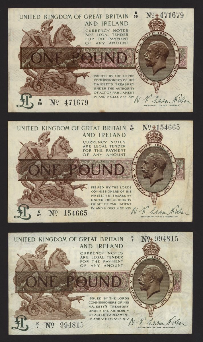 Treasury, [5 notes] £1, ND (1919), N.F. Warren Fisher, no. K/7 994815, no. K/47 154665, no. K/59 471679, no. X/27 093061, and no. X/32 216556