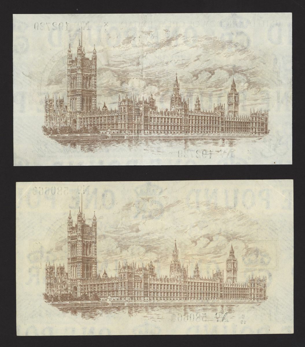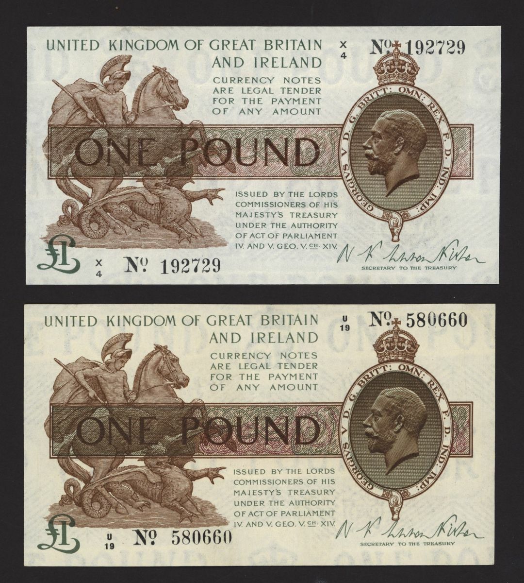 Treasury, [2 notes] £1, ND (1919), N. F. Warren Fisher, no. U/19 580660, no. X/4 192729