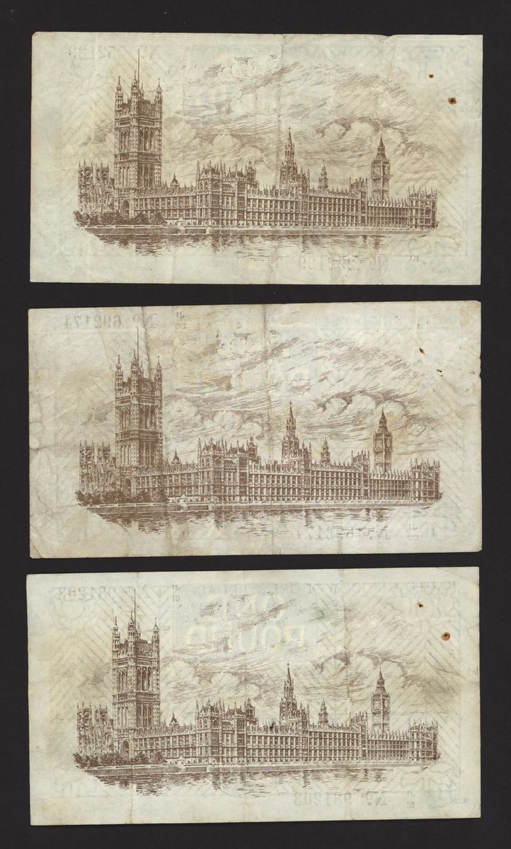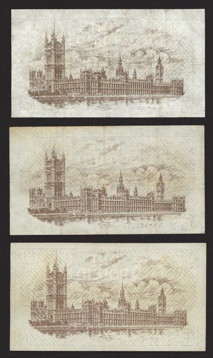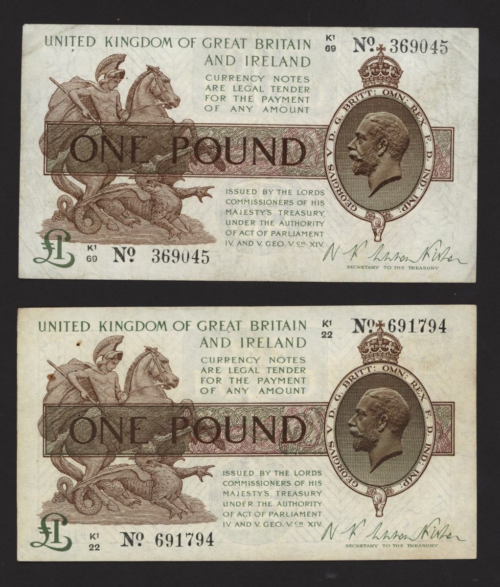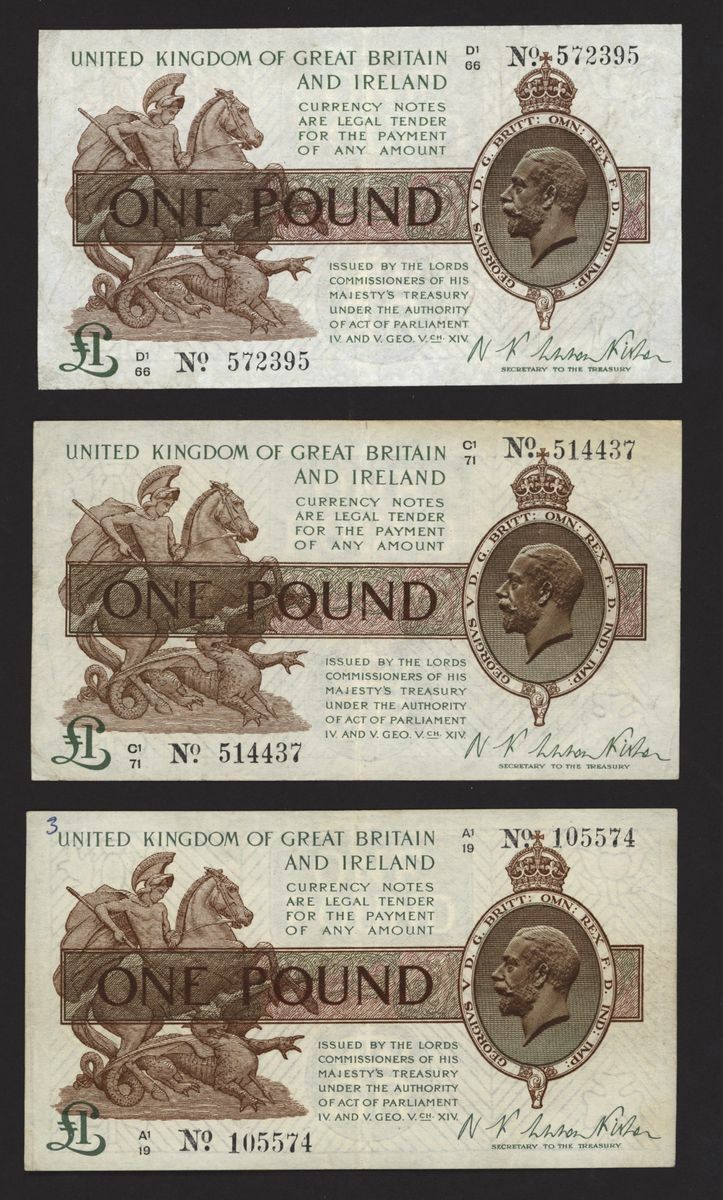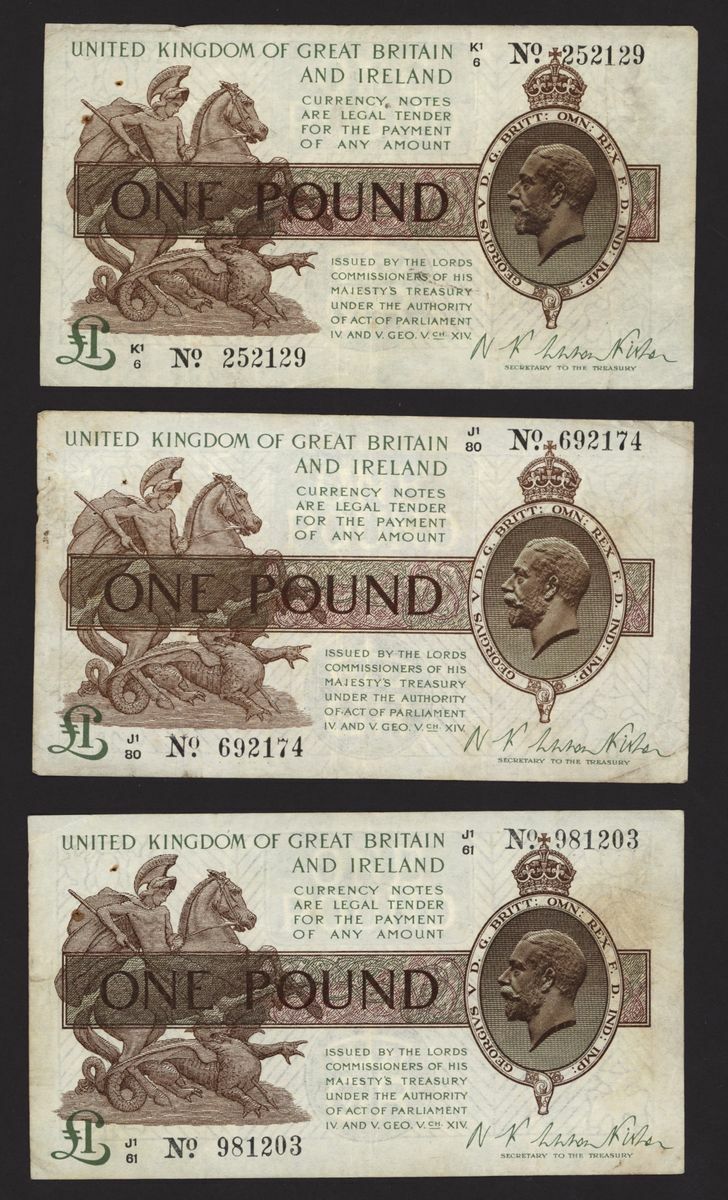 Treasury, [8 notes] £1, ND (1923), N. F. Warren Fisher, no. A1/19 105574, no. C1/71 514437, no. D1/66 572395, no. J1/61 981203, no. J1/80 692174, no. K1/6 252129, no. K1/22 691794, and no. K1/69 369045