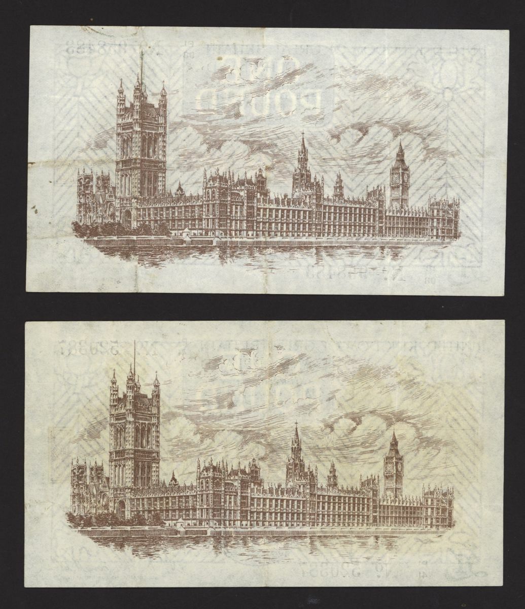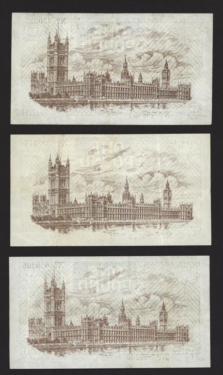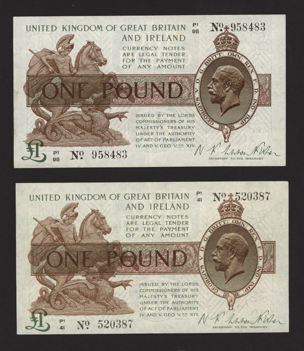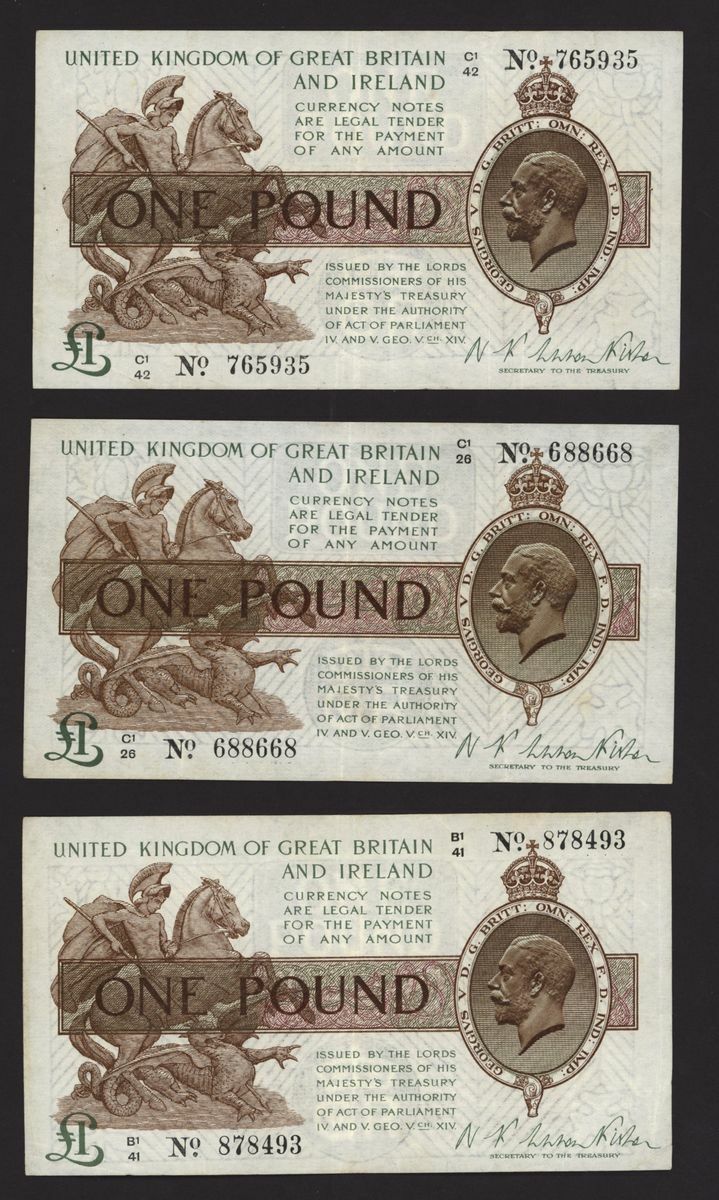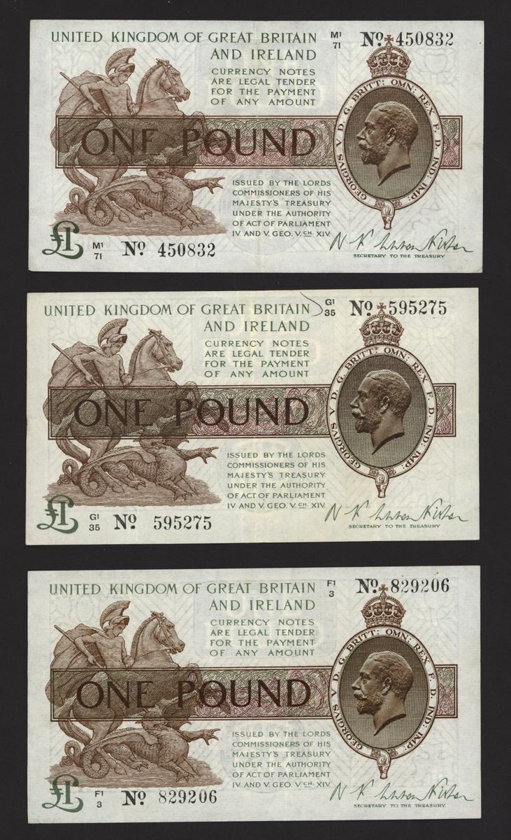 Treasury, [8 notes] £1, ND (1919), N. F. Warren Fisher, no. B1/41 878493, no. C1/26 688668, no. C1/42 765935, no. F1/3 829206, no. G1/35 595275, no. M1/71 450832, no. P1/41 520387, and no. P1/98 958483