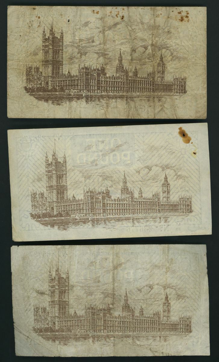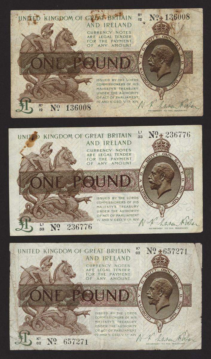 Treasury, [3 notes] £1, ND (1923), N. F. Warren Fisher, no. K1/62 657271, no. L1/33 236776, and no. R1/12 136008