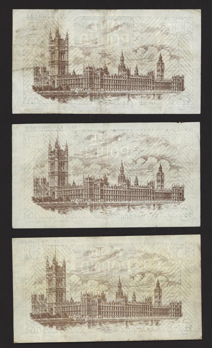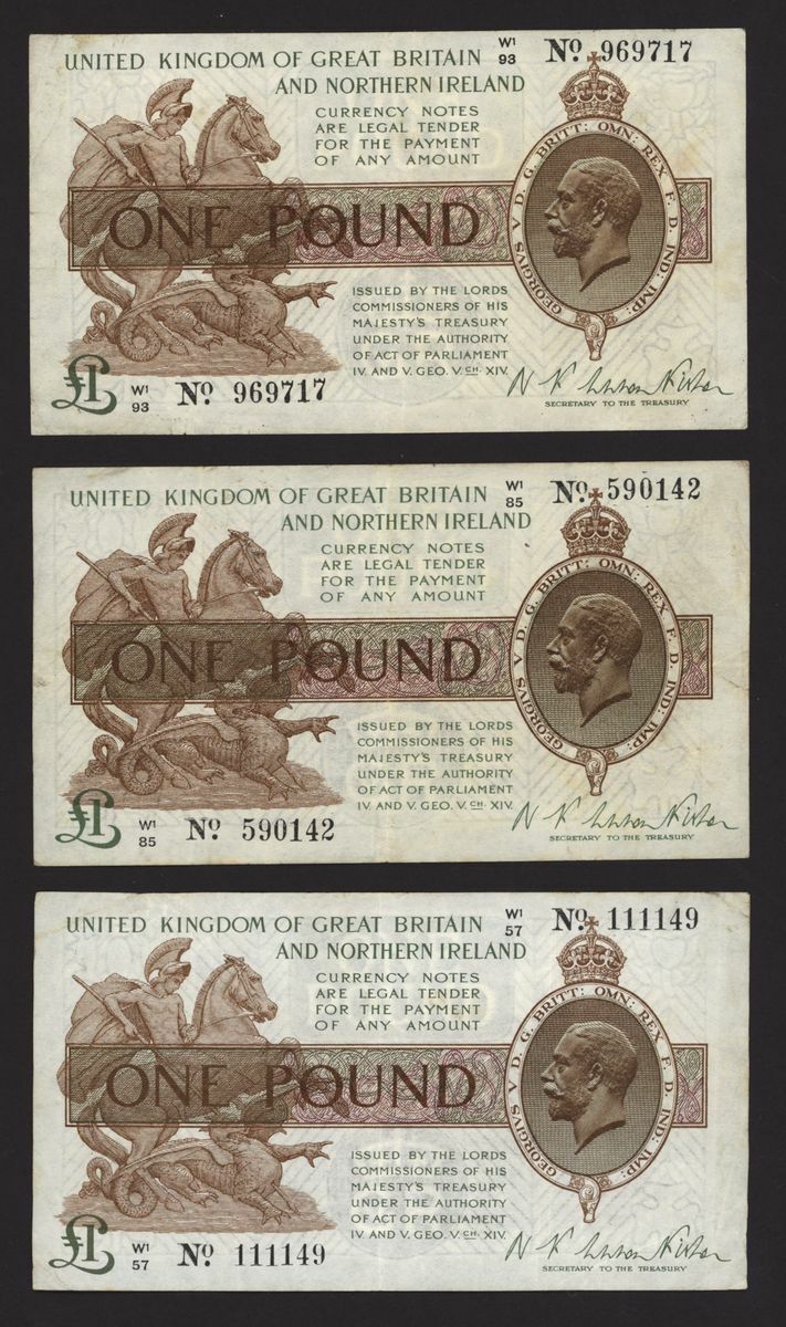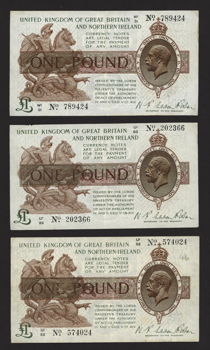 Treasury, [6 notes] £1, ND (1927), N. F. Warren Fisher, no. U1/53574024, no. U1/93 202366, no. W1/51 789424, no. W1/57 111149, no. W1/85 590142, and no. W1/93 969717