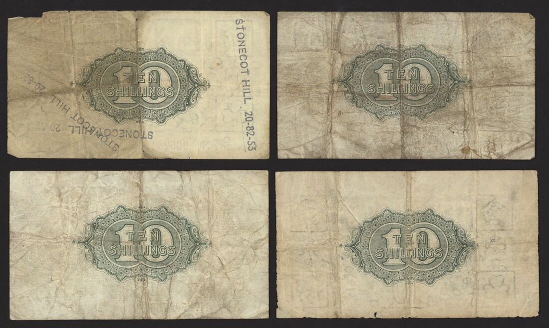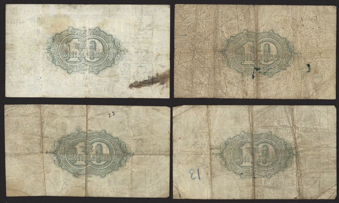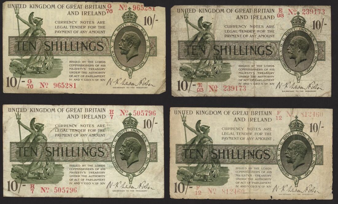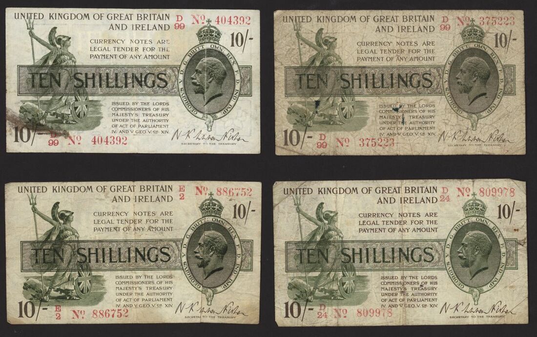 Treasury, [8 notes] 10 Shillings, ND (1919), N. F. Warren Fisher, no. D/24 809978, no. D/99 375223, no. D/99 404392, no. E/2 886752, no. E/93 239173, no. F/12 812460, no. G/76 965281, and no. H/7 505796