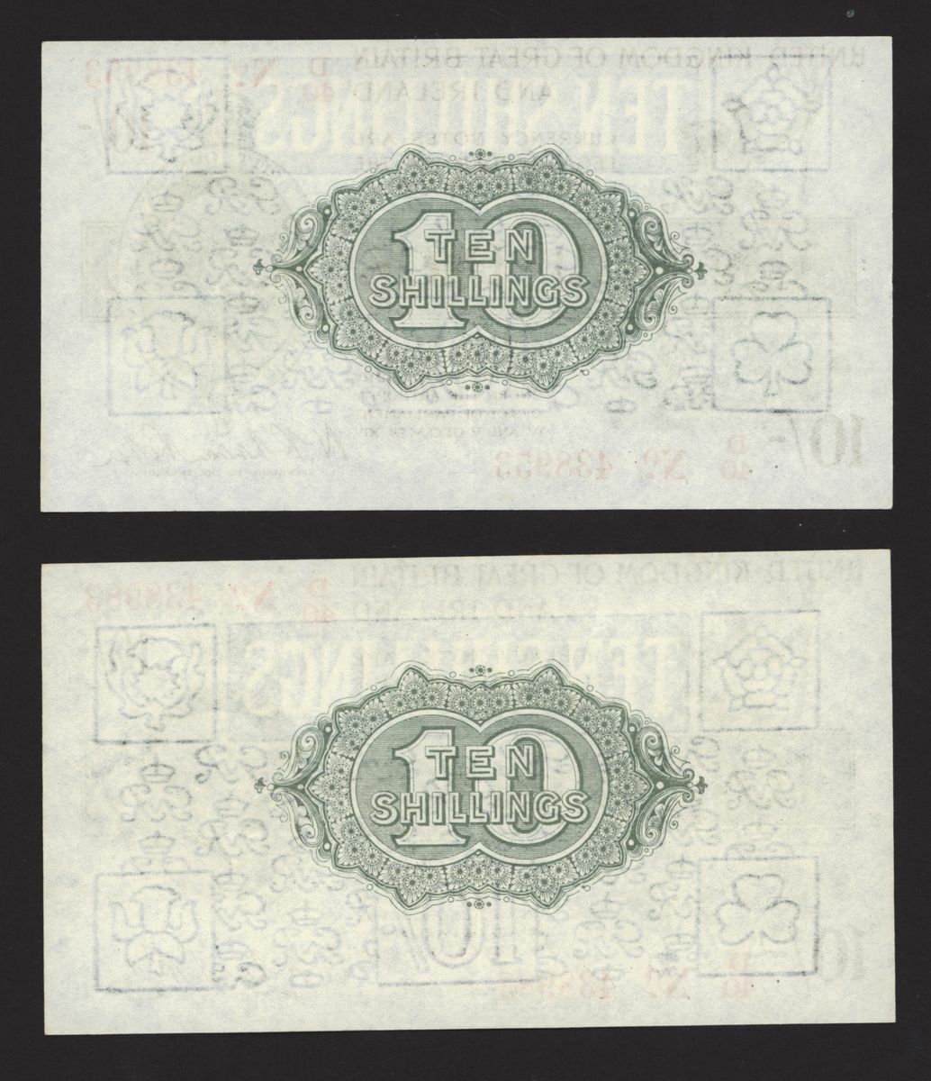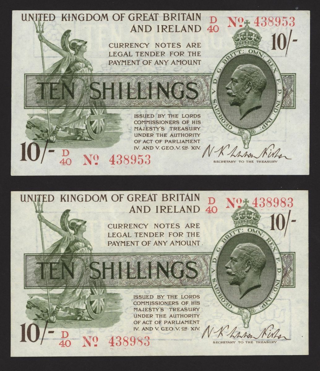 Treasury, [2 notes] 10 Shillings, ND (1919), N. F. Warren Fisher, no. D/40 438953, no. D/40 438983