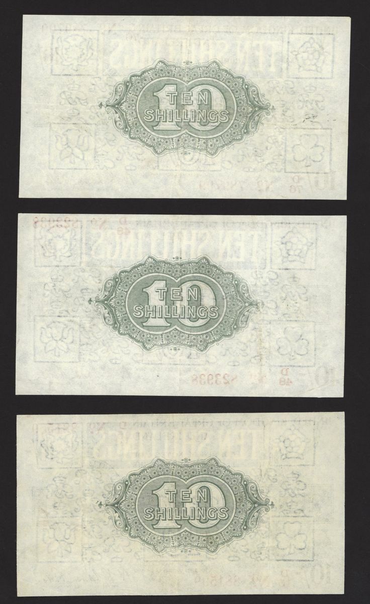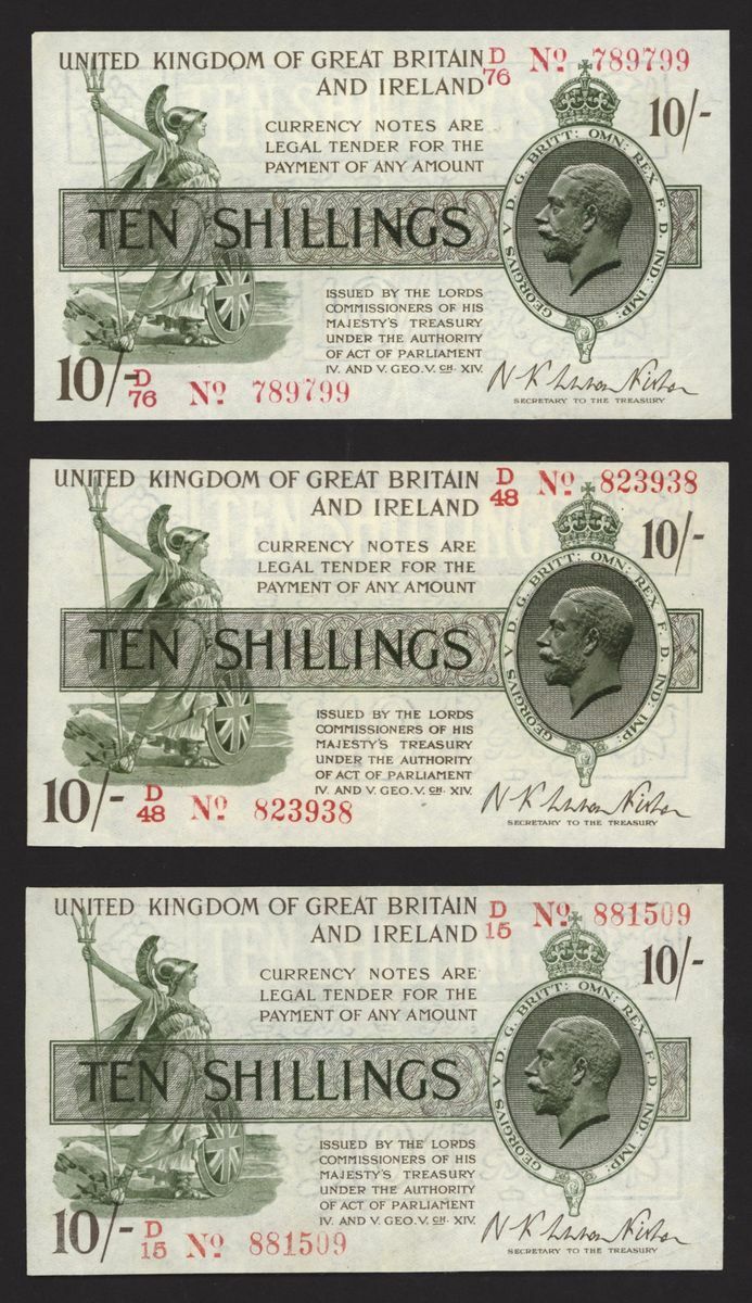 Treasury, [3 notes] 10 Shillings, ND (1919), N. F. Warren Fisher, no. D/15 881509, no. D/48 823938, and no. D/76 789799