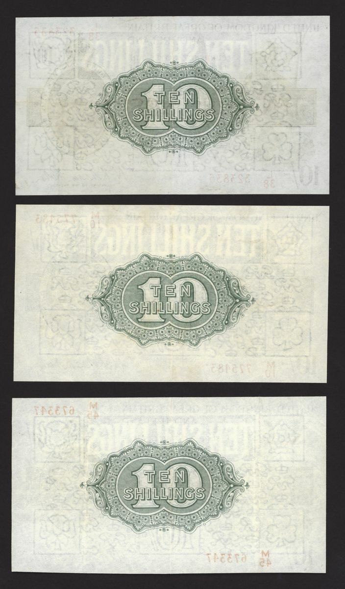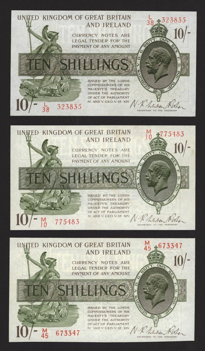 Treasury, [3 notes] 10 Shillings, ND (1922), N. F. Warren Fisher, no. L/38 323835, no. M/10 775483, and no. M/45 673347