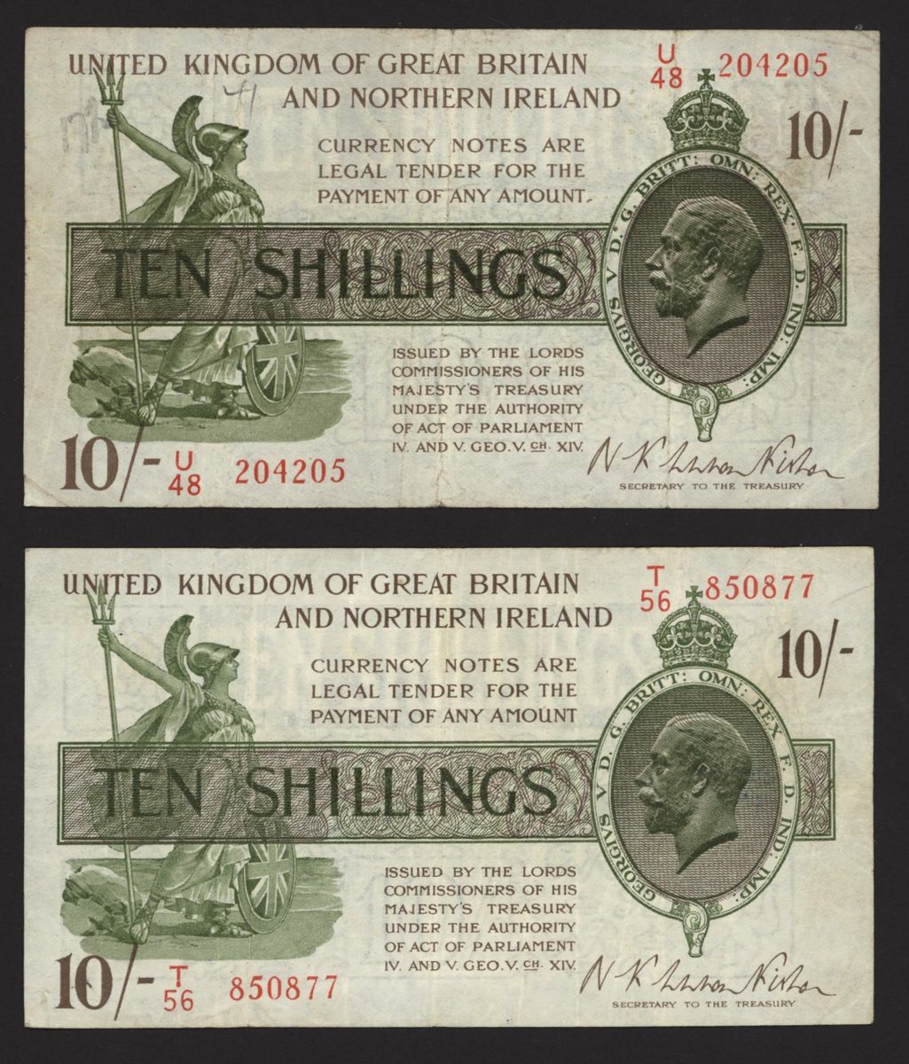 Treasury, [2 notes] 10 Shillings, ND (1927), N. F. Warren Fisher, no. T/56 850877, no. U/48 204205