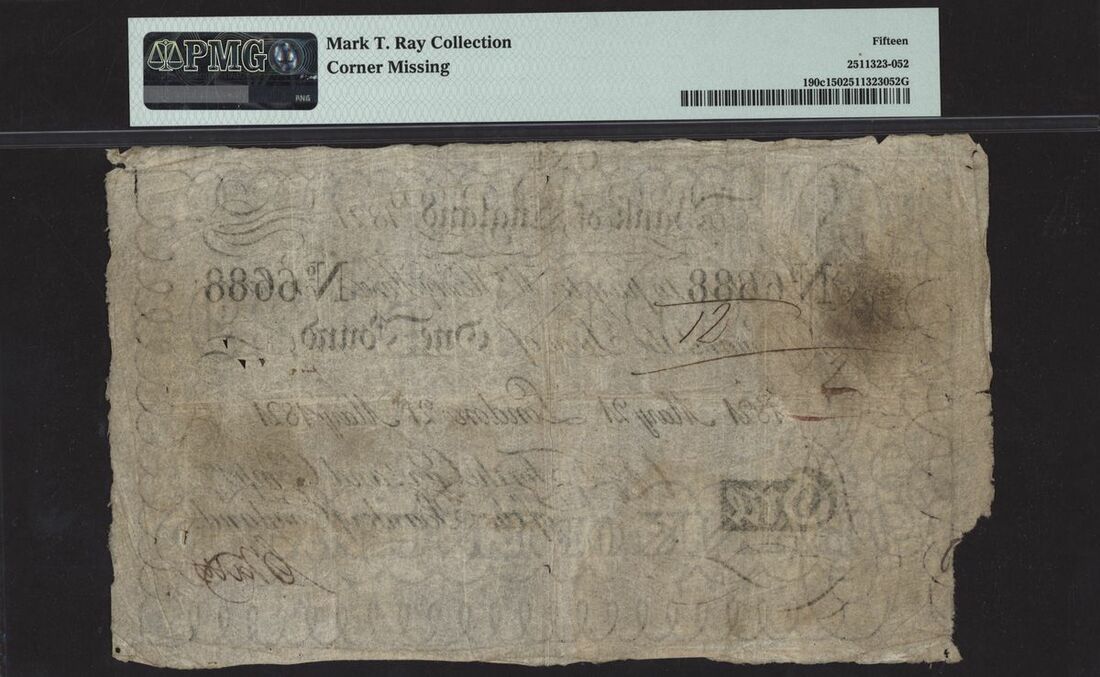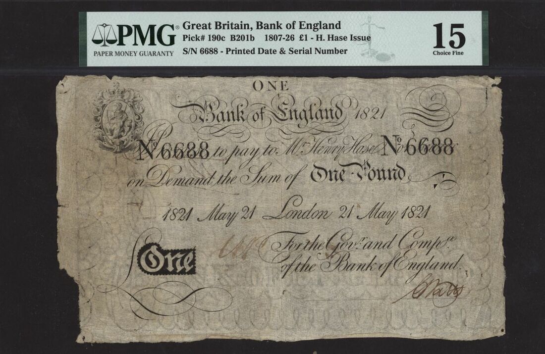 Bank of England, White Note, £1, London, 21 May 1821, no. 6688, H. Hase, (Pick 190c, EPM B201b), in PMG holder 15 Choice Fine, corner missing