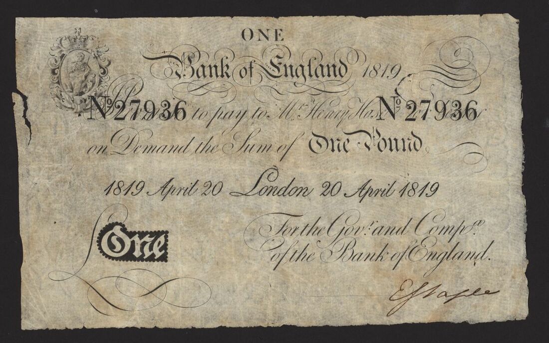 Bank of England, White Note, £1, London, 20 April 1819, no. 27936, H. Hase, (Pick 190c, EPM B201b), left tear, otherwise near very fine