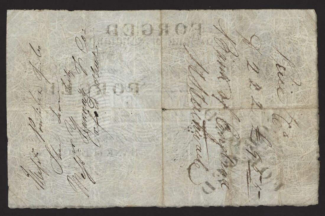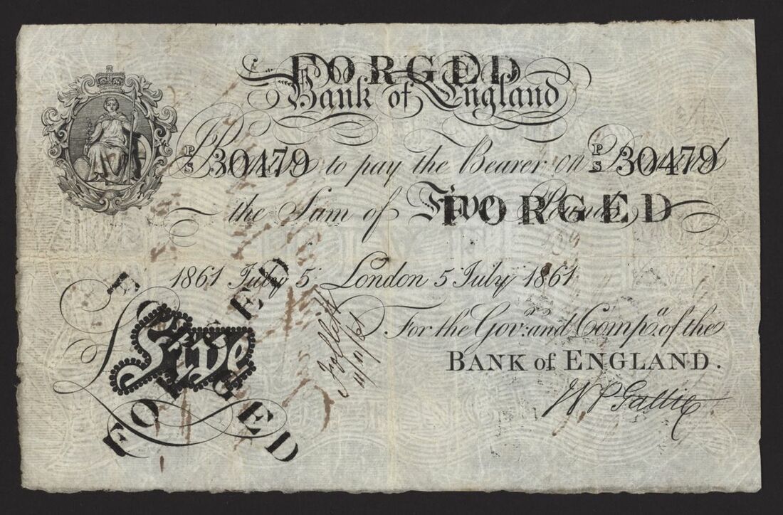 Bank of England, White Note, forged £5, London, 5 July 1861, no. P/S 30479, M. Marshall, contemporary forgery, repeatedly marked with black "FORGED" stamp