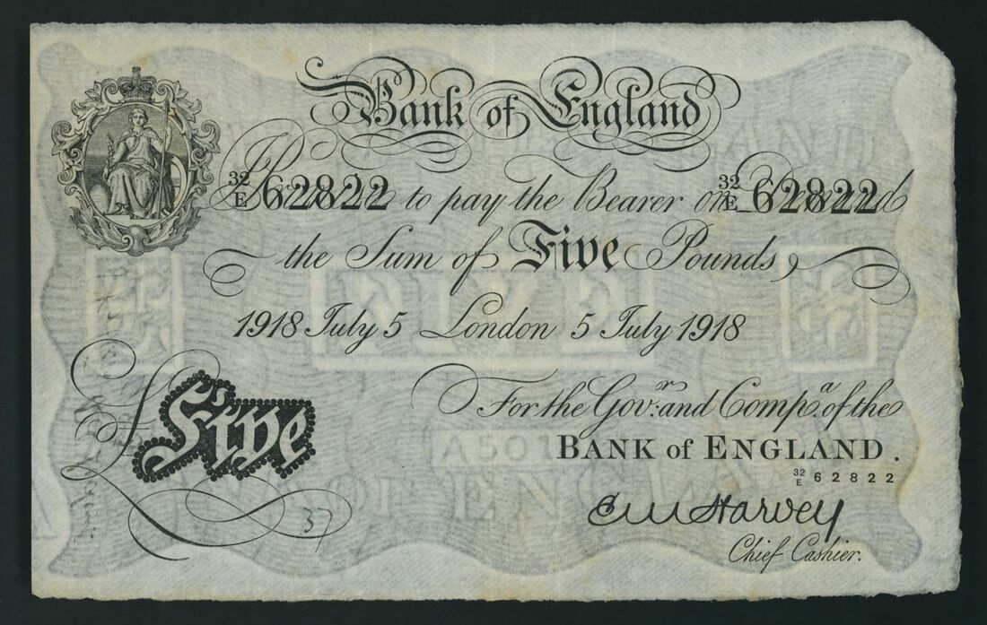 Bank of England, White Note, £5, London, 5 July 1918, no. 32/E 62822, E. M. Harvey, (Pick 312a, EPM B209a), good very fine, scarce early war date