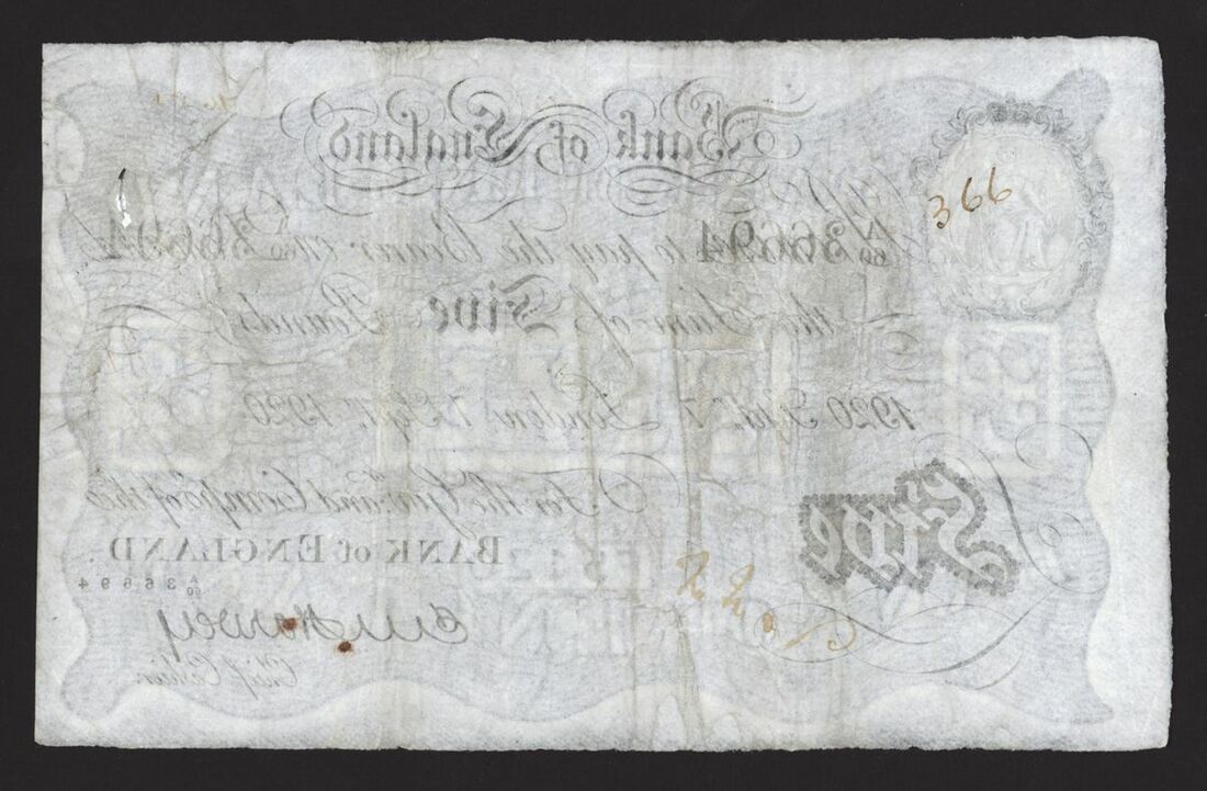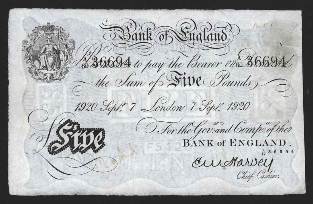 Bank of England, White Note, £5, London, 7 September 1920, no. A/60 36694, E.M. Harvey (Pick 312a, EPM B209a), about very fine, minor faults