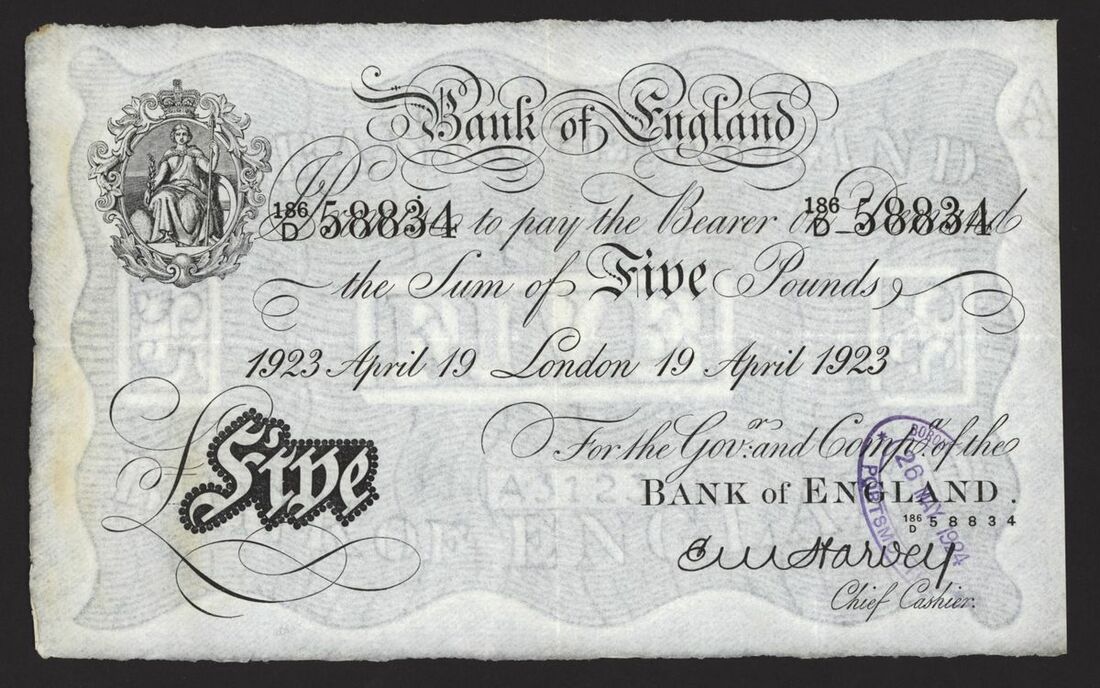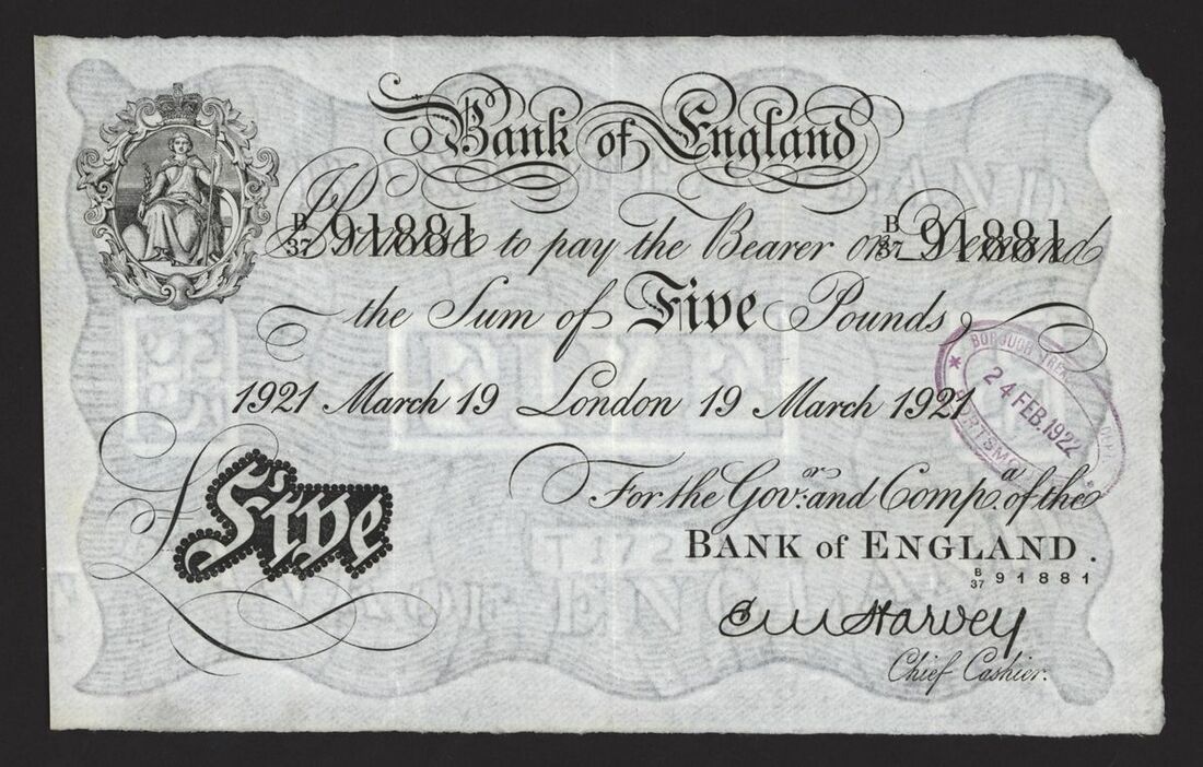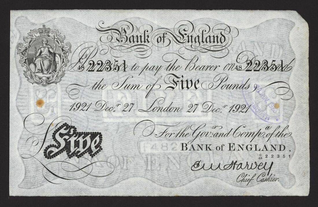 Bank of England, White Note, [3 notes] £5, London, 1921-1923, E. M. Harvey, all with Borough Treasurer Portsmouth handstamp,