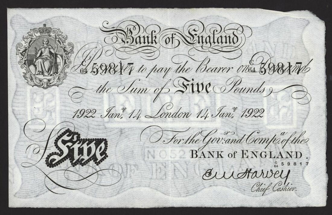 Bank of England, White Note, [2 notes] £5, London, 14 January 1922, E. M. Harvey, no. C/64 59816, no. C/64 59817