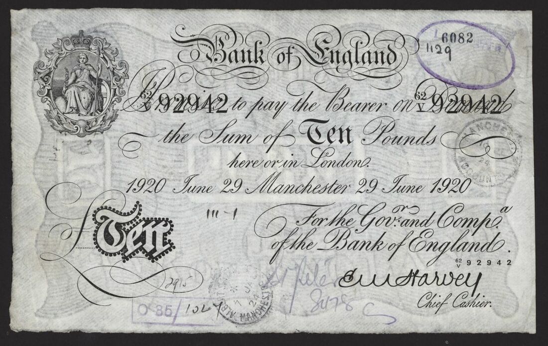 Bank of England, White Note, £10, Manchester, 29 June 1920, no. 62/V 92942, E. M. Harvey, numerous bank stamps