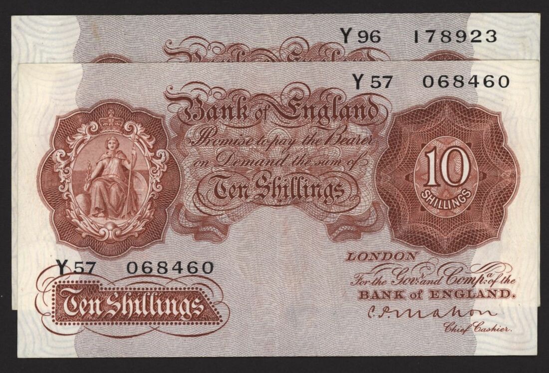 Bank of England, [2 notes] 10 Shillings, London, ND (1928), C. P. Mahon, no. Y57 068460, no. Y96 178923