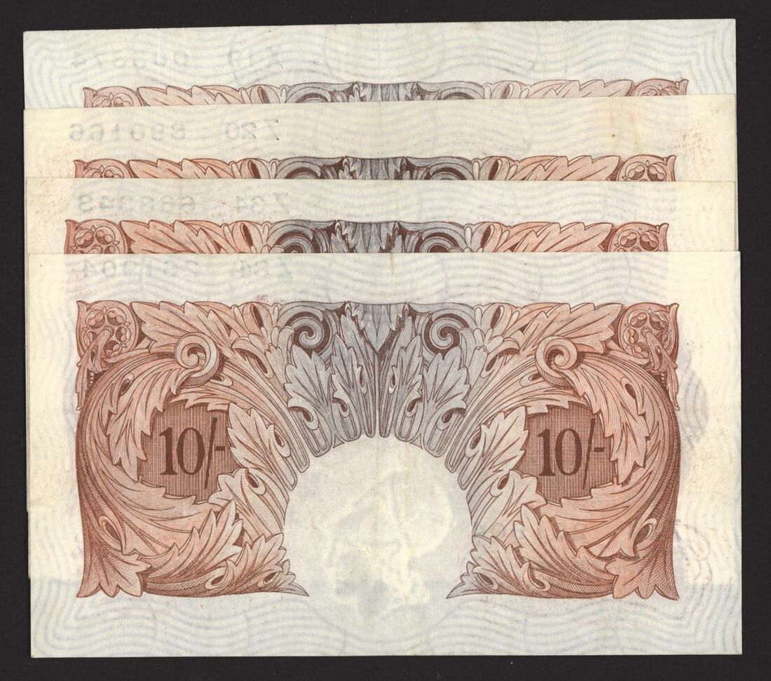 Bank of England, [4 notes] 10 Shillings, London, ND (1928), C. P. Mahon, no. X19 005874, no. Z20 890166, no. Z34 668343, and no. Z84 261904
