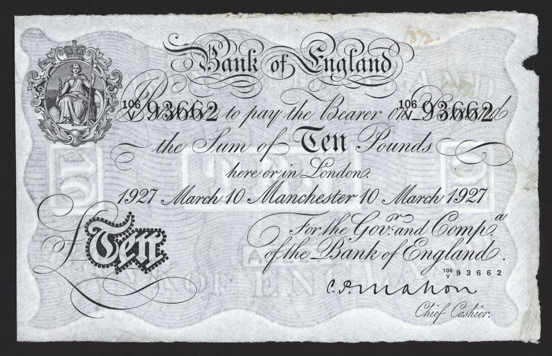 Bank of England, White Note, £10, Manchester, 10 March 1927, no. 106/V 93662, C. P. Mahon, (Pick 321c, EPM B216), extremely fine, pressed, rare