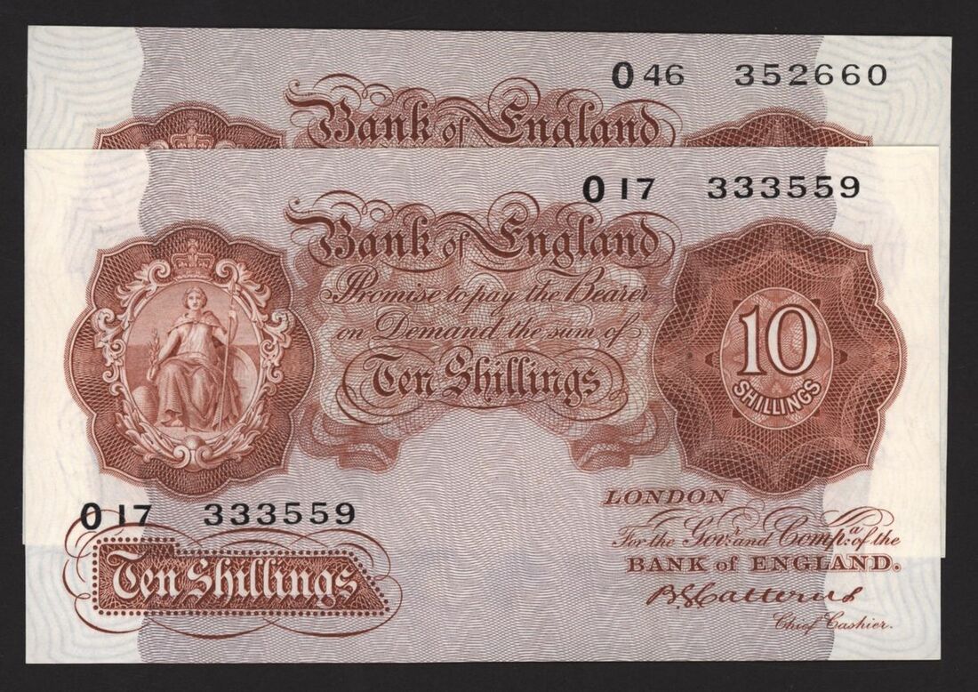 Bank of England, [2 notes] 10 Shillings, London, ND (1930), B. G. Catterns, no. O17 333559, no. O46 352660