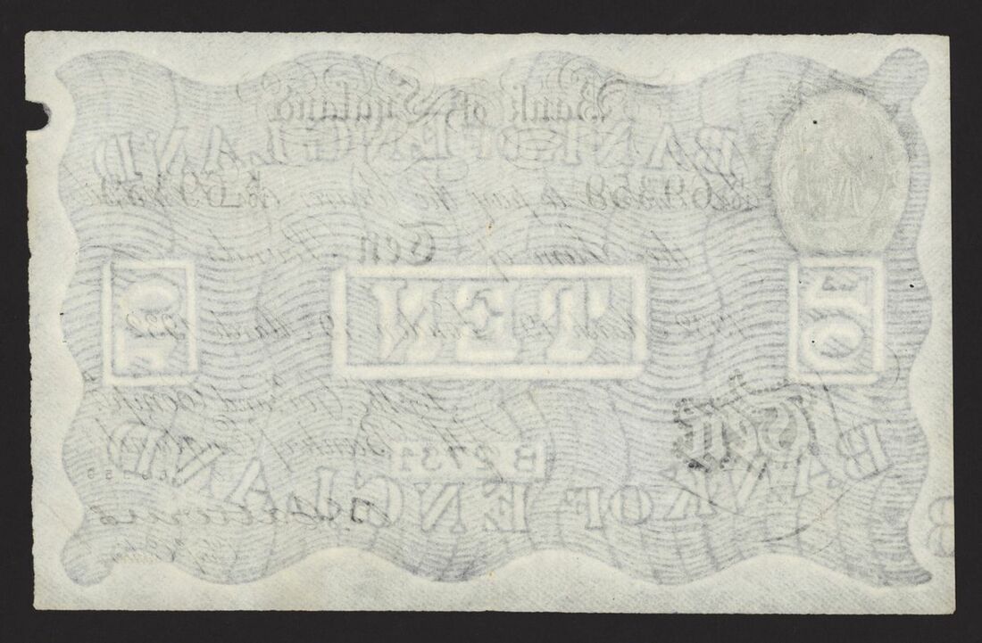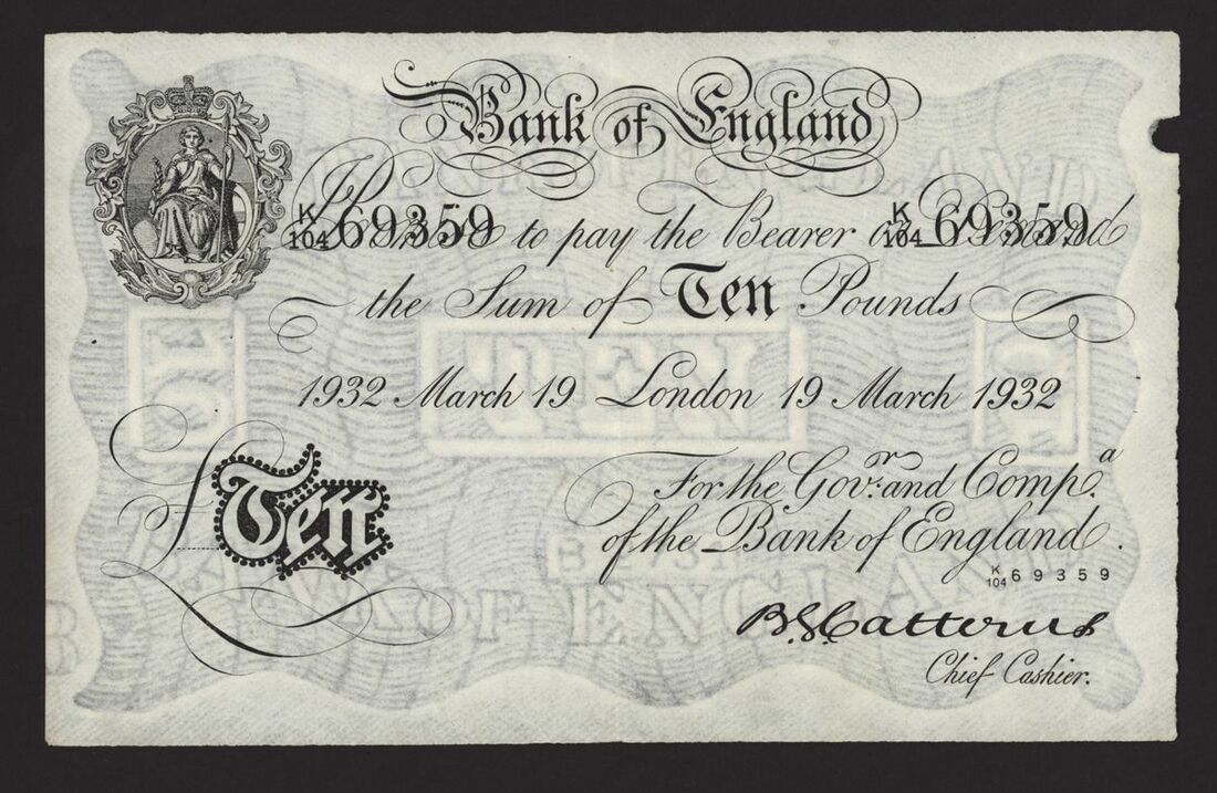 Bank of England, White Note, German forgery, £10, London, 19 March 1932, no. K/104 69359, B. G. Catterns, Nazi-produced counterfeit note created by concentration camp prisoners as part of Operation Bernhard