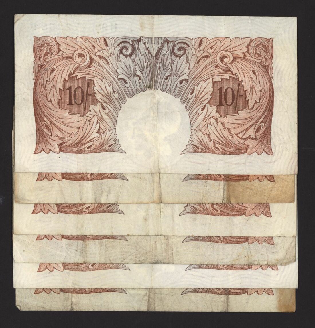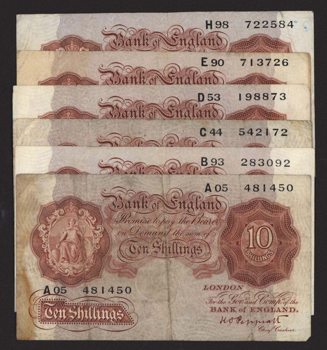 Bank of England, [6 notes] 10 Shillings, London, ND (1934), K. O. Peppiatt, no. A05 481450, no. B93 283092, no. C44 542172, no. D53 198873, no. E90 713726, and no. H98 722584