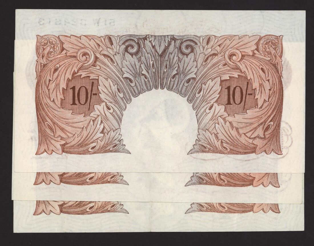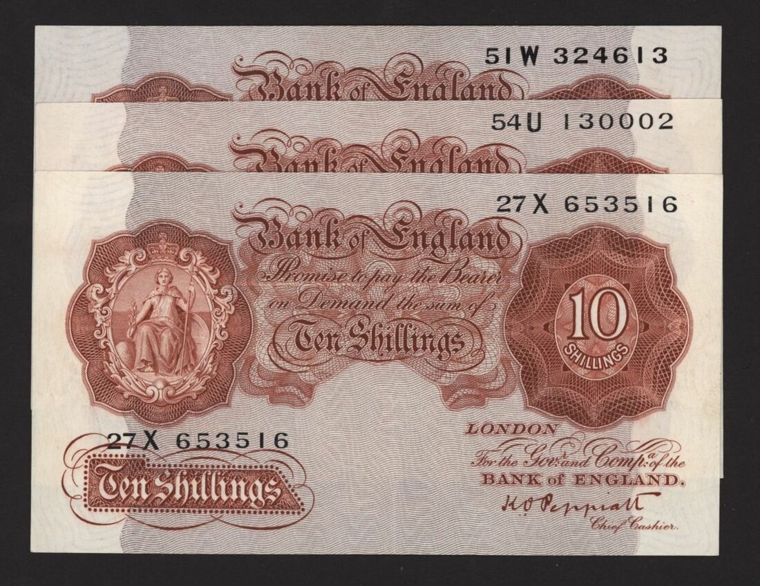 Bank of England, [3 notes] 10 Shillings, London, ND (1934), K. O. Peppiatt, no. 54U 130002, no. 51W 324613, and no. 27X 653516