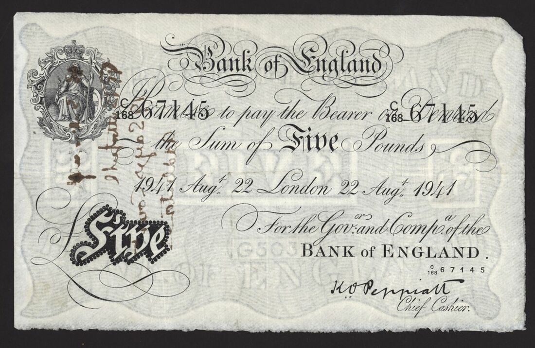 Bank of England, White Note, £5, London, 22 August 1941, no. C/168 67145, K. O. Peppiatt, (Pick 335a, EPM B241), good very fine