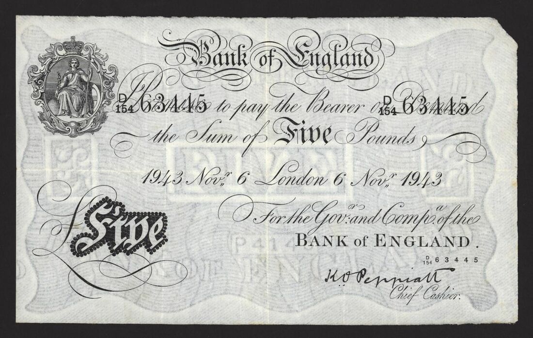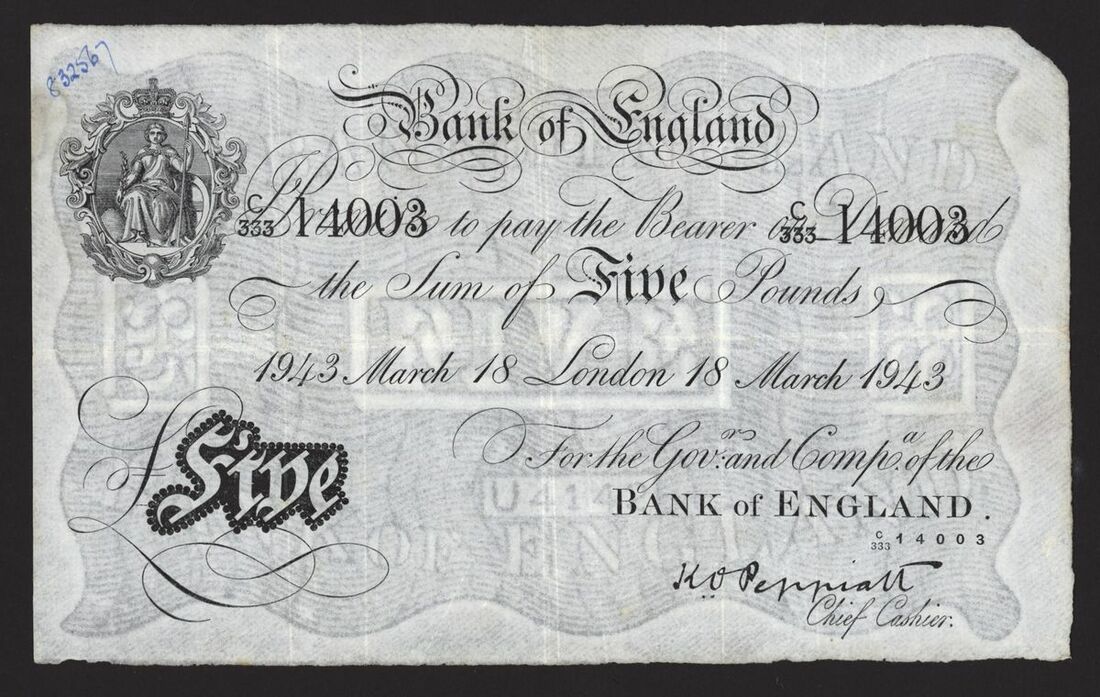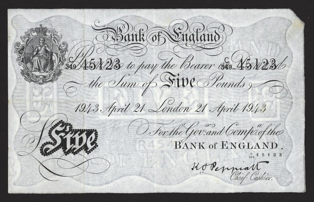 Bank of England, White Note, [3 notes] £5, London, 1943, K. O. Peppiatt, 18 March 1943, no. C/333 14003; 21 April 1943, no. C/349 45123; 6 November 1943, no. D/154 63445