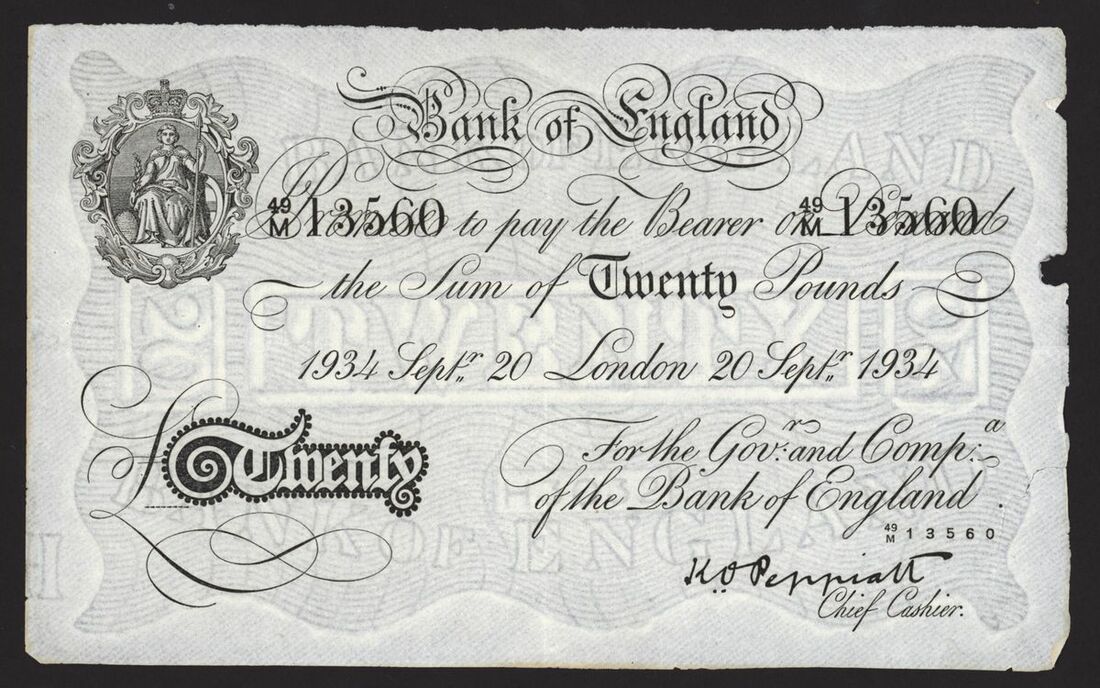 Bank of England, White Note, German forgery, £20, London, 20 September 1934, no. 49/M 13560, K. O. Peppiatt, Nazi-produced counterfeit note created by concentration camp prisoners as part of Operation Bernhard