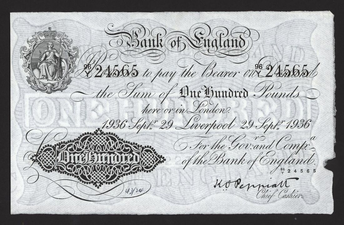 Bank of England, White Note, £100, Liverpool, 29 September 1936, no. 96/Y 24565, K. O. Peppiatt, (Pick 339b, EPM B245e), about uncirculated