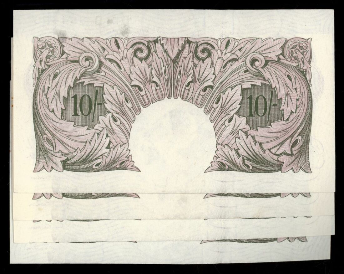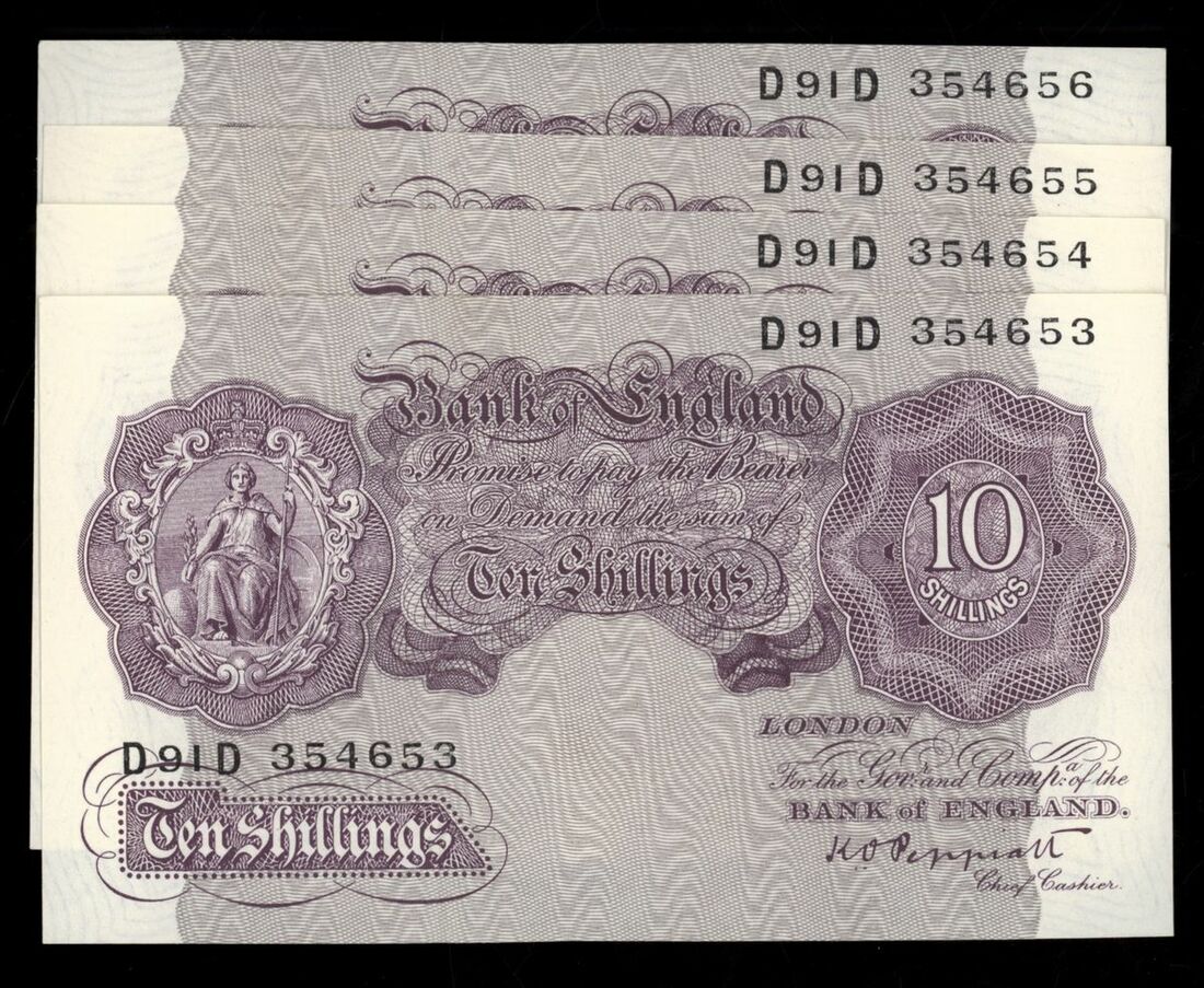 Bank of England, [4 notes] 10 Shillings, London, ND (1940), K. O. Peppiatt, mauve emergency war issue, consecutive run, nos. D91D 354653-354656
