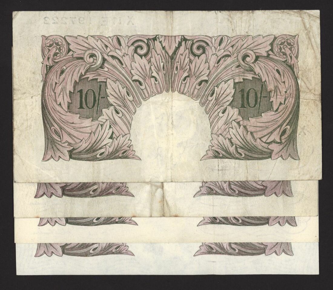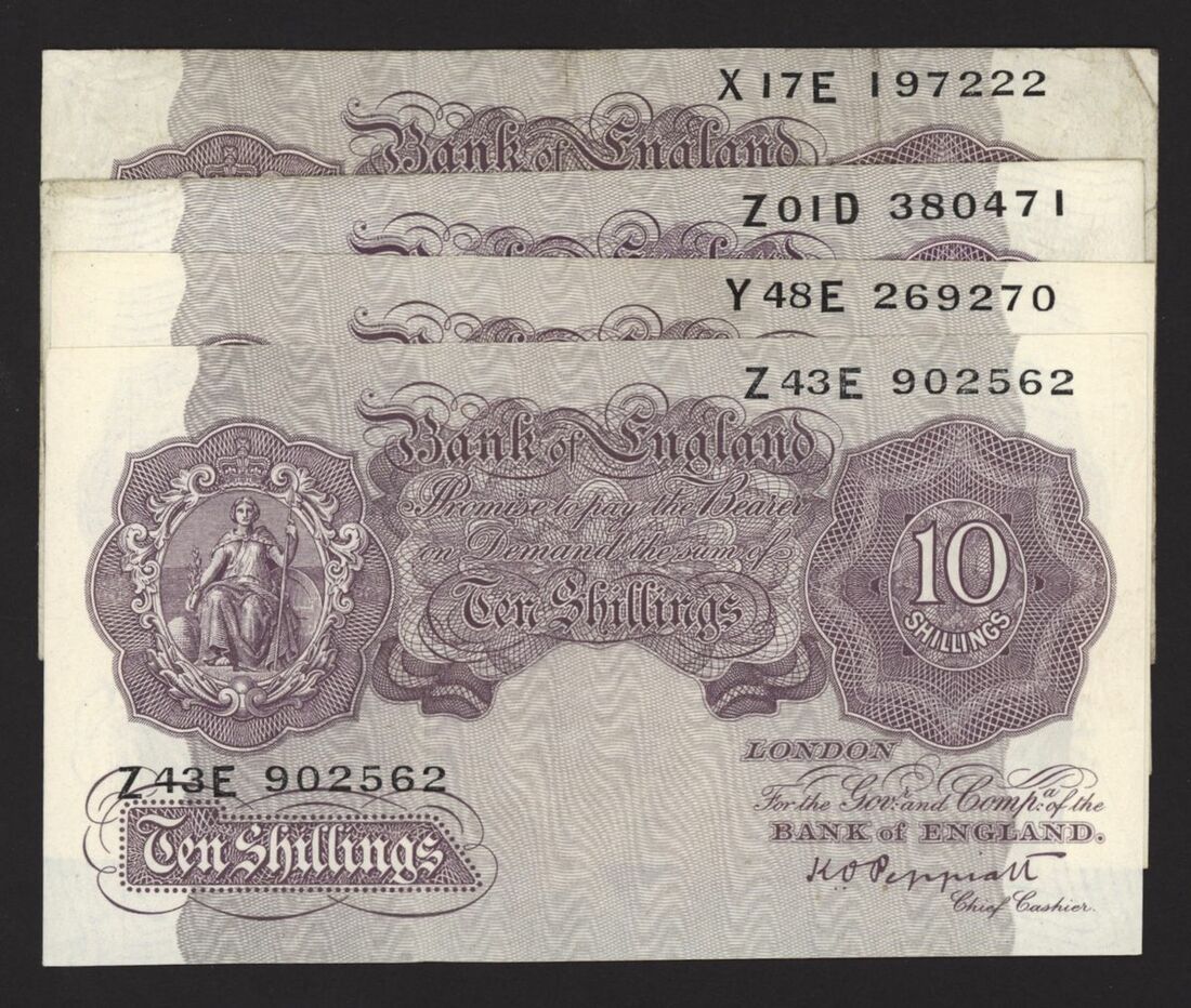 Bank of England, [4 notes] 10 Shillings, London, ND (1940), K. O. Peppiatt, mauve emergency war issue, no. Z01D 380471, no. Z43E 902562, no. Y48E 269270, and no. X17E 197222, penultimate prefix, scarce