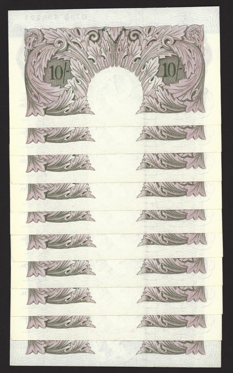 Bank of England, [10 notes] 10 Shillings, London, ND (1940), K. O. Peppiatt, mauve emergency war issue, consecutive run, nos. O79D 438212-438221